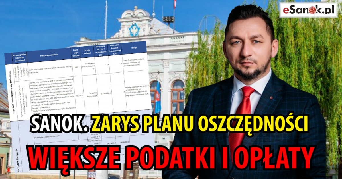 W ostatnim czasie do radnych Rady Miasta Sanoka trafił dokument zawierający „założenia do planu oszczędnościowego”. Jak czytamy: „plan oszczędnościowy Gminy Miasta Sanoka ma na celu poprawę sytuacji finansowej. Ze względu na strukturę budżetu miasta optymalizacja obejmuje działania w zakresie spłaty zadłużenia, ograniczenia wydatków, zwiększenia dochodów oraz poprawy jakości usług publicznych. Opracowana informacja (założenia) przedstawia proponowane kroki i działania, które zostaną podjęte w obecnym budżecie w 2024 r. oraz perspektywie kolejnego roku budżetowego”.