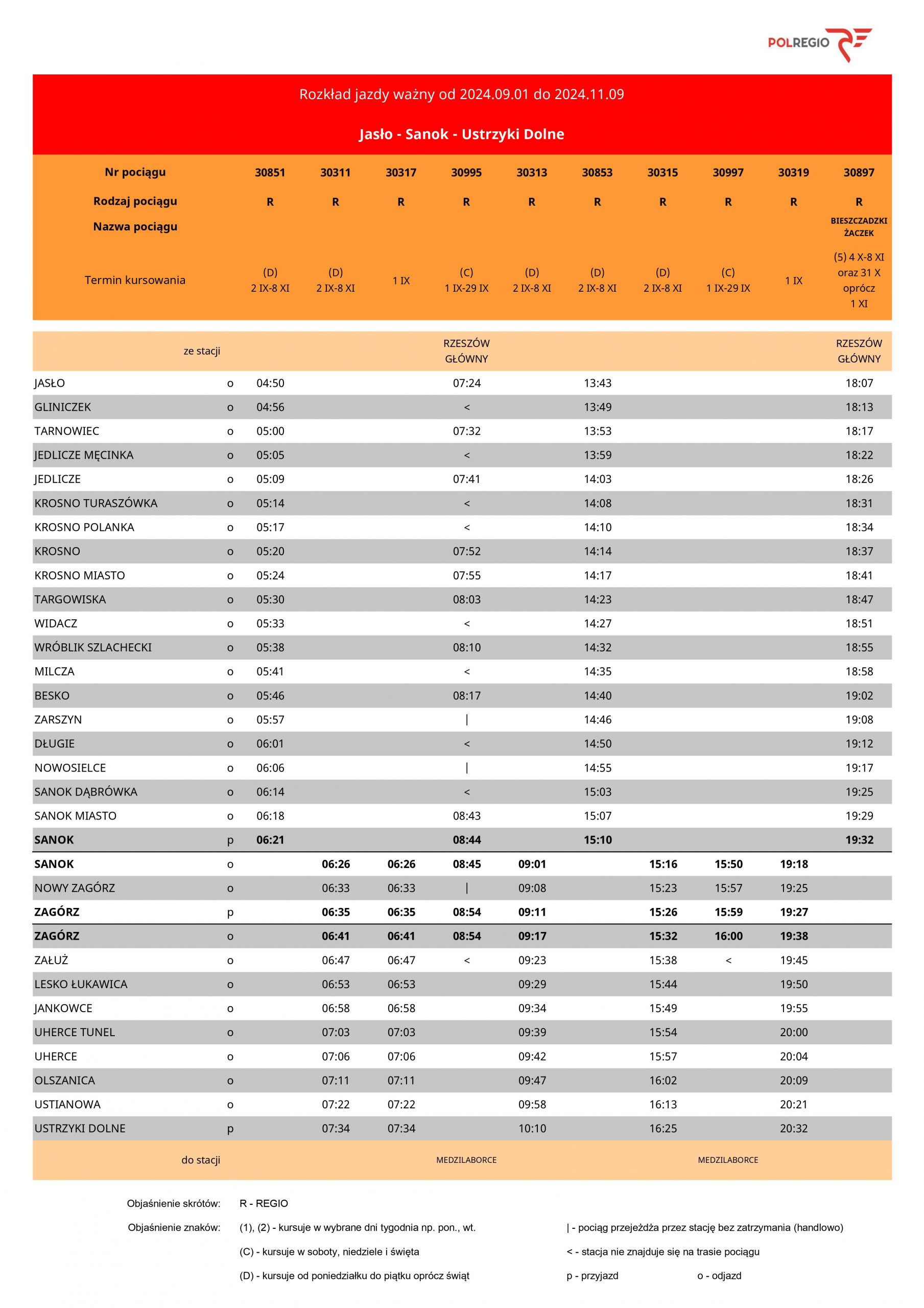 Do końca września kursują natomiast pociągi w relacji Rzeszów – Medzilaborce – Rzeszów i Sanok – Medzilaborce – Sanok. Od października będzie ponownie kursował weekendowy pociąg z Rzeszowa do Sanoka – „Bieszczadzki Żaczek” oraz pociąg z Rzeszowa do Gorlic.