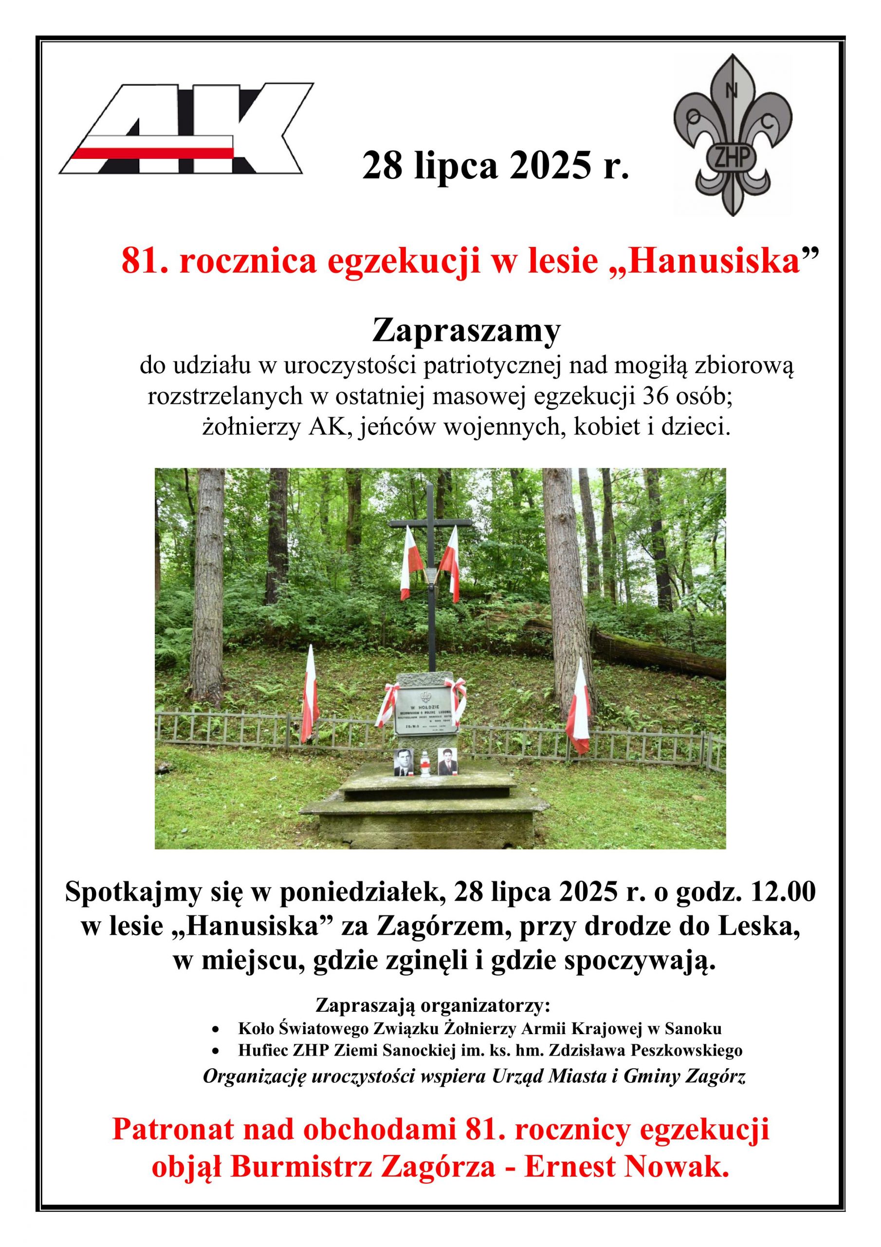 GMINA ZAGÓRZ. 28 lipca 2025 r. (poniedziałek) w 81. rocznicę egzekucji w lesie „Hanusiska” odbędą się uroczystości patriotyczne nad mogiłą zbiorową rozstrzelanych w ostatniej masowej egzekucji 36 osób; żołnierzy AJ, jeńców wojennych, kobiet i dzieci.