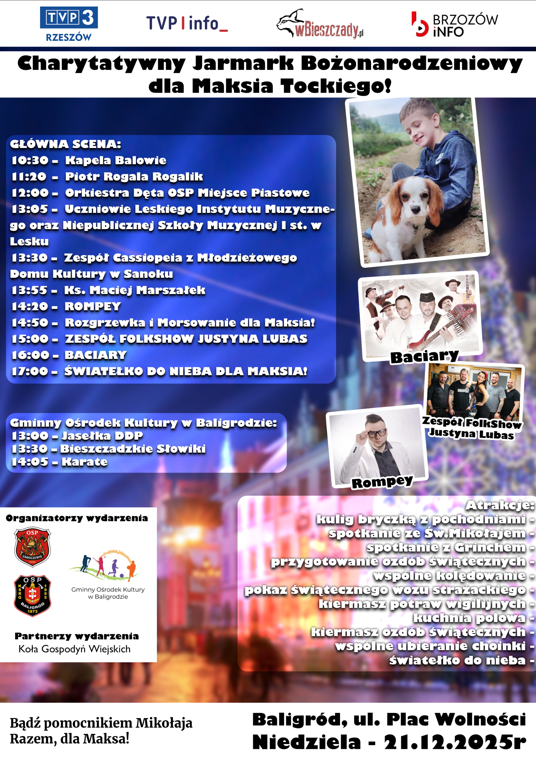 Baligród już po raz kolejny zamieni się w świąteczną stolicę regionu, jednak tegoroczny Jarmark Bożonarodzeniowy będzie miał szczególny charakter. 21 grudnia na Placu Wolności odbędzie się wyjątkowe wydarzenie charytatywne, podczas którego zbierane będą środki na leczenie Maksia Tockiego. Organizatorami są OSP KSRG Baligród oraz OSP Zahoczewie, a inicjatywa już teraz porusza serca mieszkańców całych Bieszczadów.