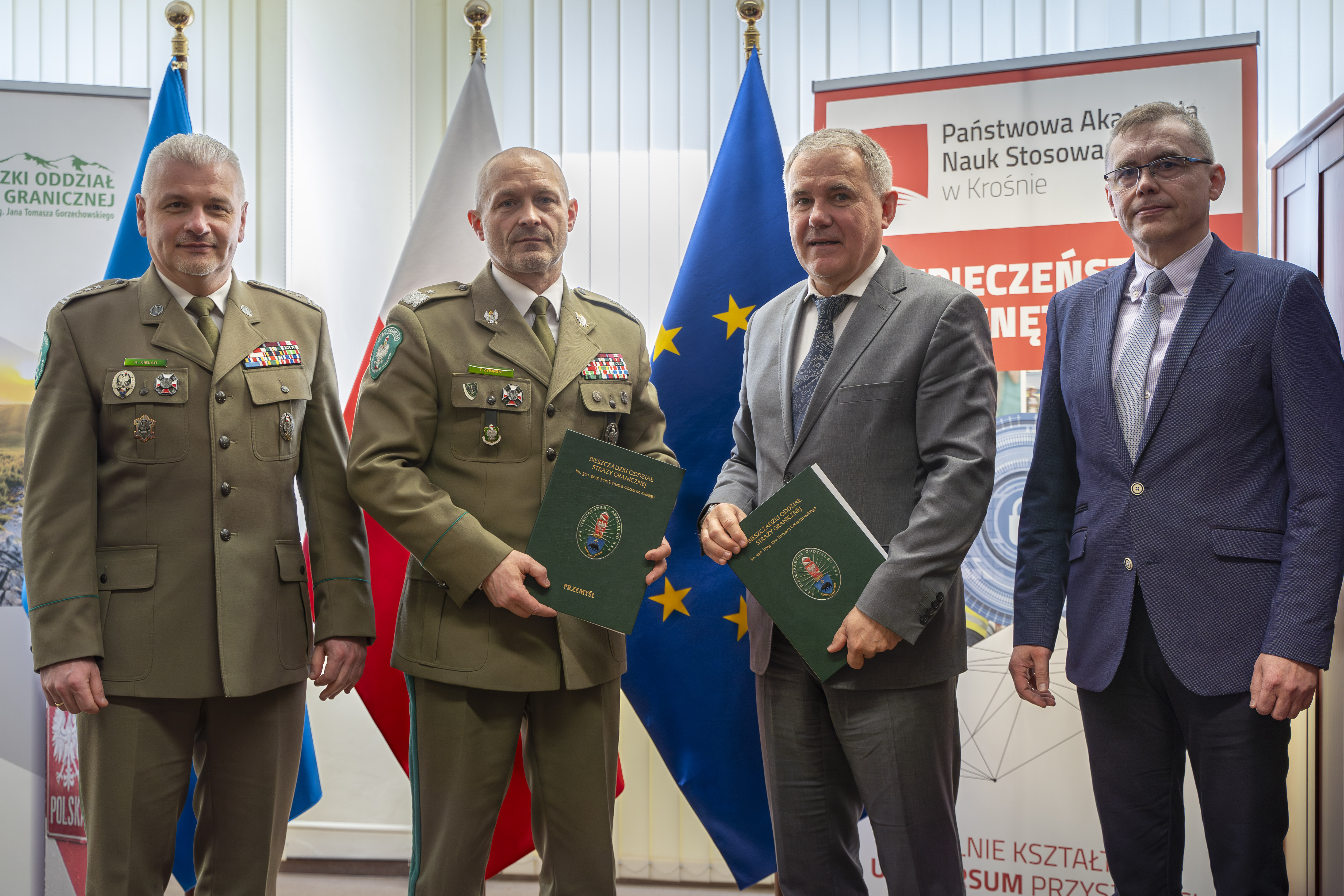 W celu uregulowania obszarów współpracy gen. bryg. SG Tomasz Zybiński, Komendant BiOSG oraz dr hab. Zbigniew Barabasz, Rektor PANS, podpisali stosowne porozumienie. W wydarzeniu uczestniczyli także płk SG Robert Kielar Zastępca Komendanta BiOSG właściwy ws. logistycznych oraz dr. Jacek Kraś, Kierownik Zakładu Bezpieczeństwa Wewnętrznego PANS.