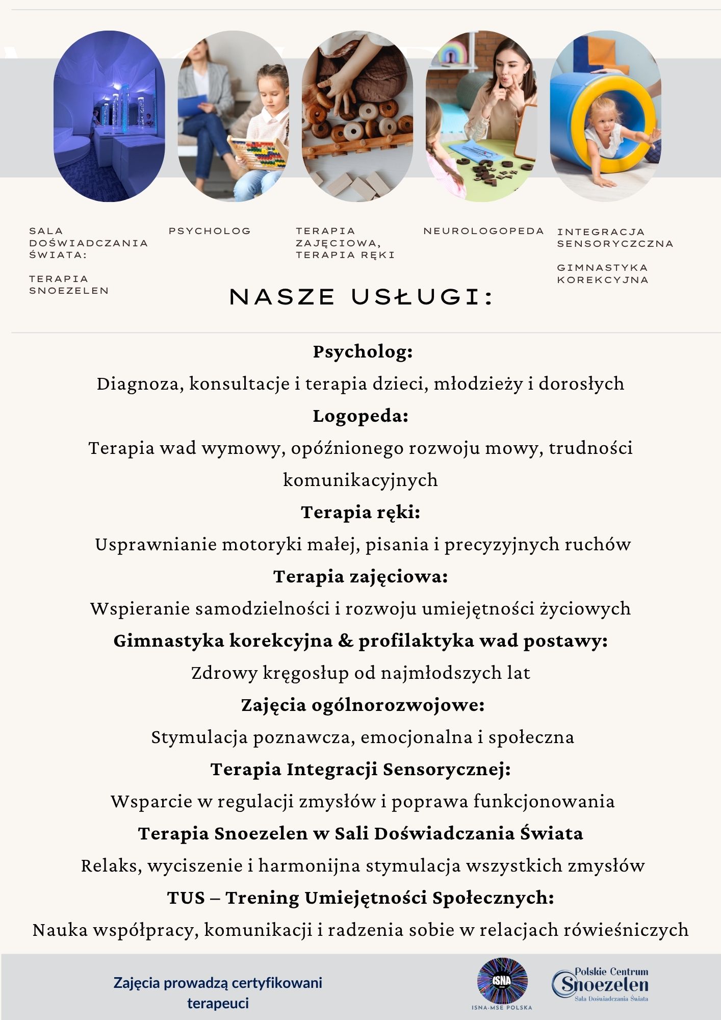 - Logopeda – terapia wad wymowy, opóźnionego rozwoju mowy i trudności komunikacyjnych;