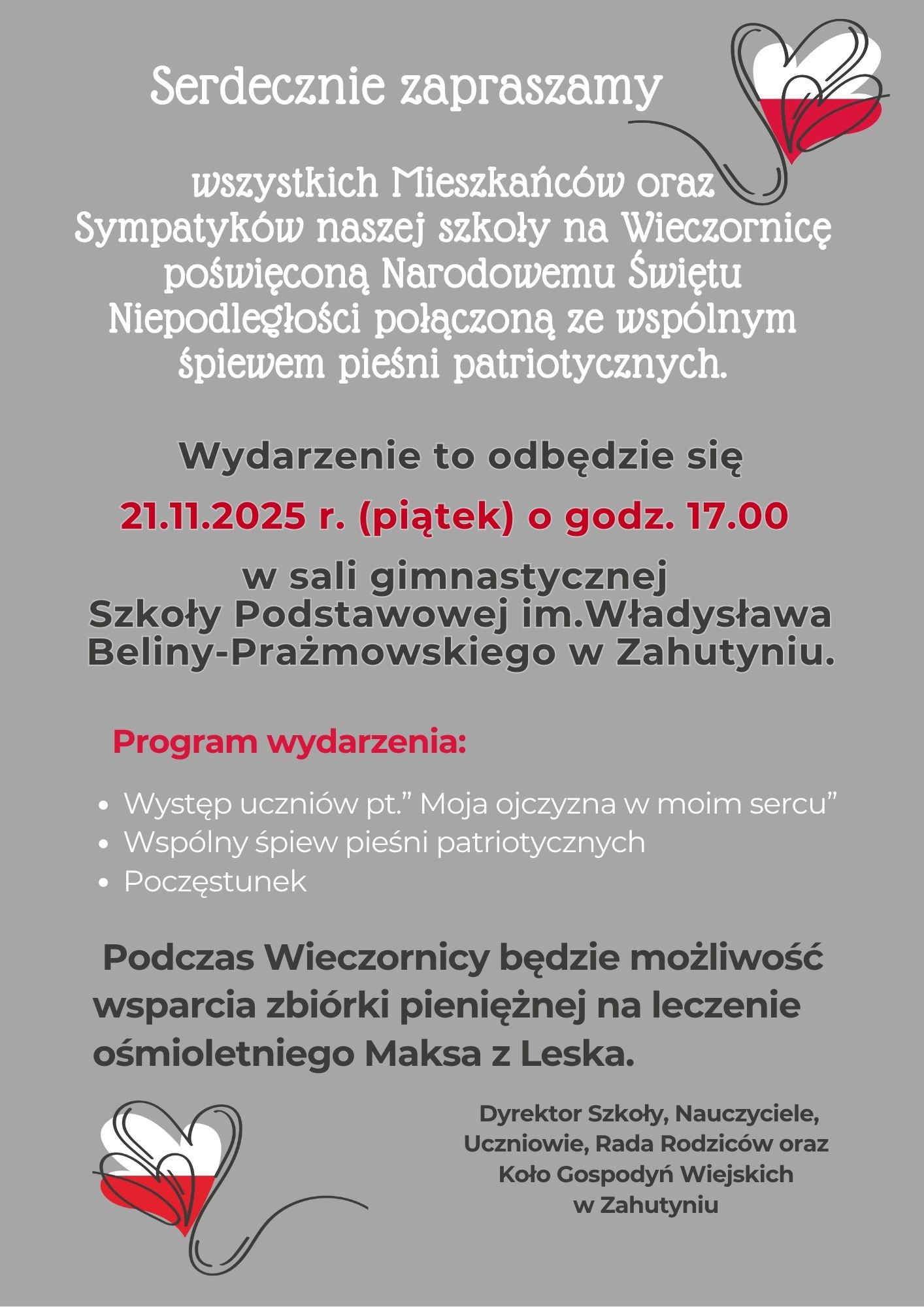 W Zahutyniu szykuje się wyjątkowe, charytatywne wydarzenie, którego celem jest pomoc ośmioletniemu Maksymilianowi Tockiemu z Dziurdziowa. Już dziś o godz. 17:00, w sali gimnastycznej Szkoły Podstawowej im. Władysława Beliny-Prażmowskiego odbędzie się Wieczornica Patriotyczna połączona ze zbiórką pieniędzy na leczenie chłopca.