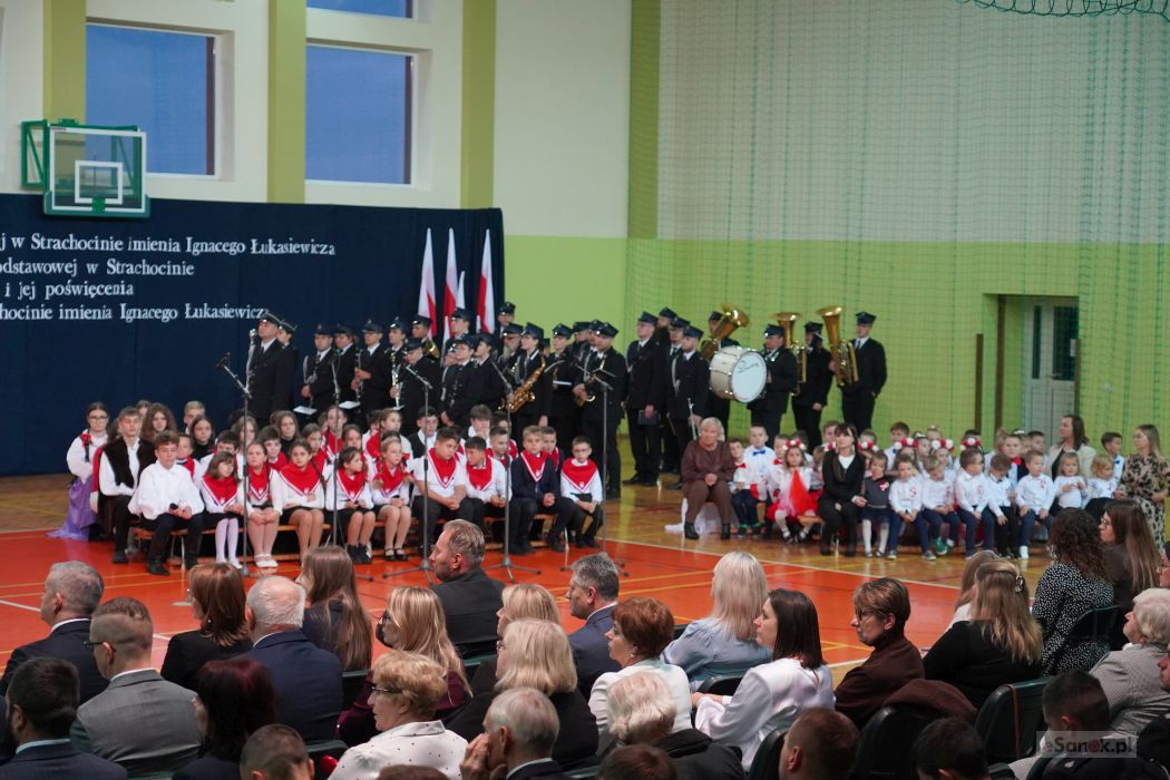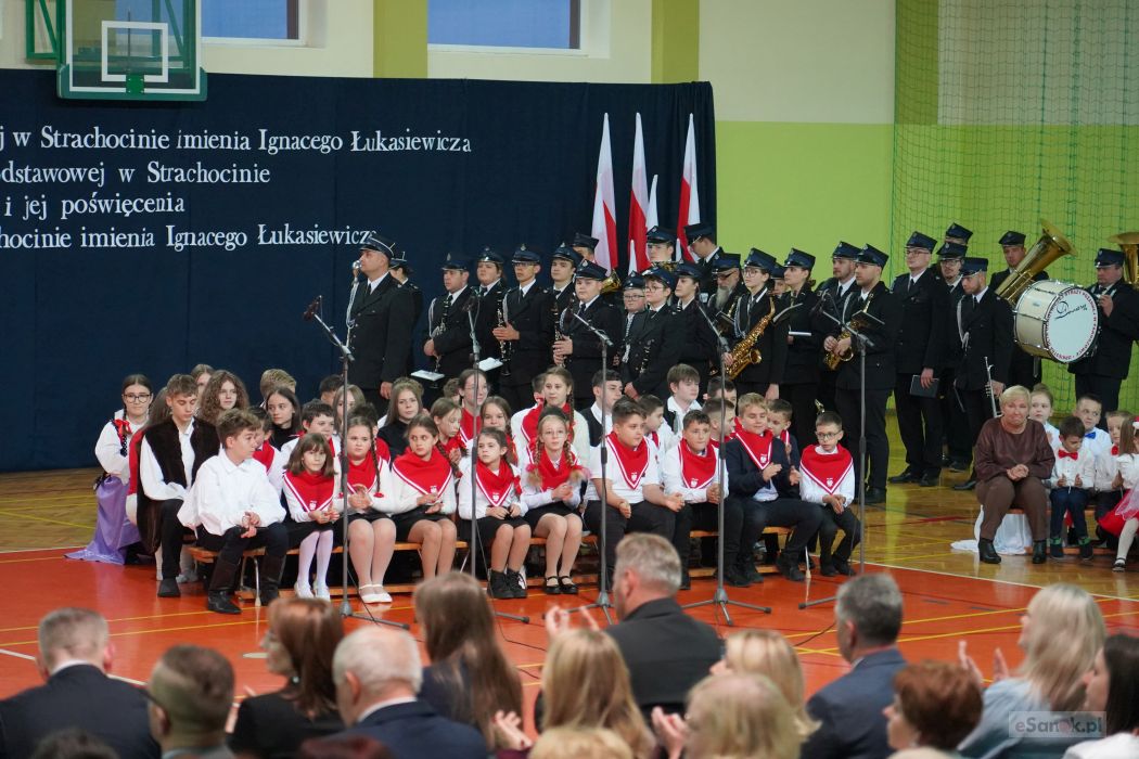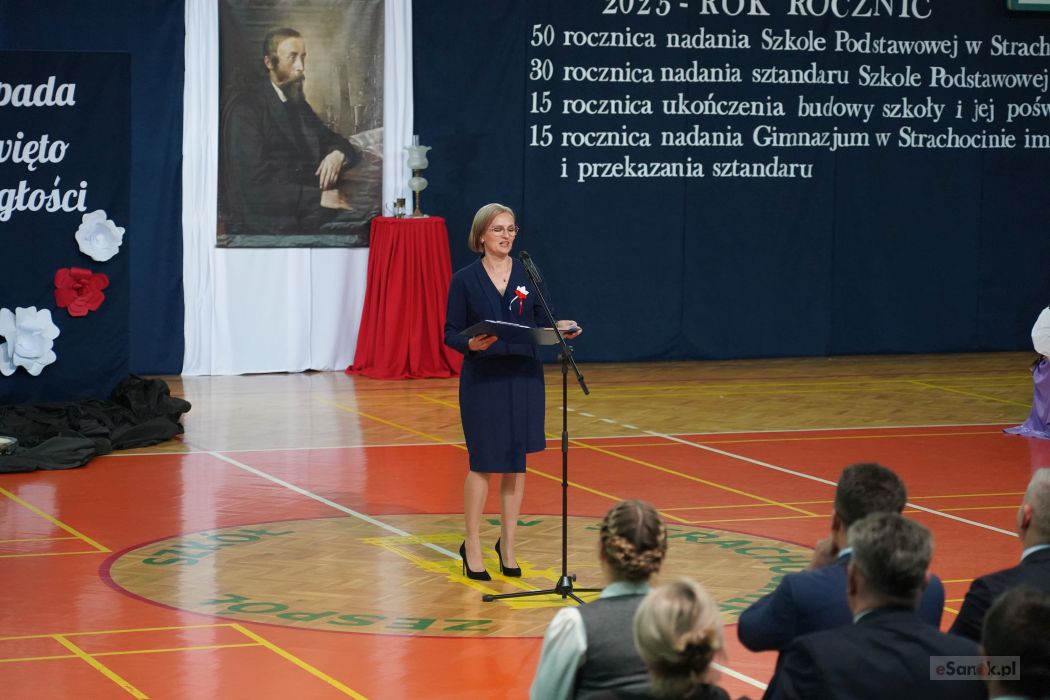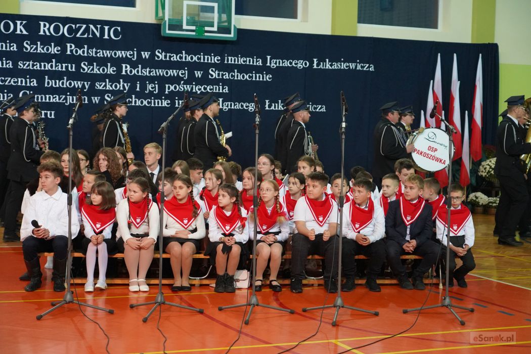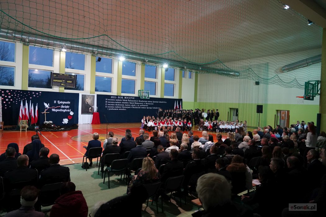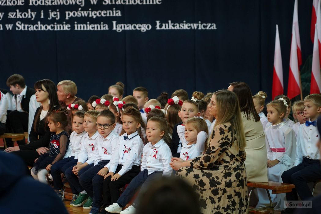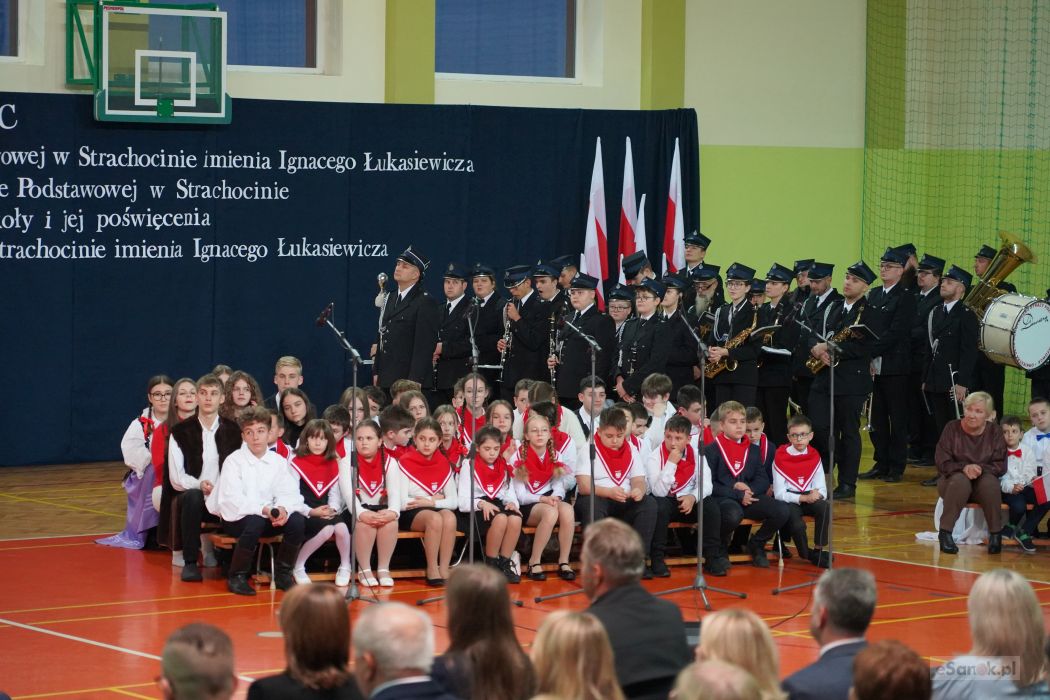 Druga część obchodów odbyła się w Szkole Podstawowej im. Ignacego Łukasiewicza w Strachocinie. Zebranych przywitał Wójt Gminy Sanok Paweł Wdowiak, a następnie głos zabrała dyrektor szkoły Magdalena Wiszyńska. Po wprowadzeniu sztandarów i odśpiewaniu hymnu państwowego rozpoczęto część artystyczną uroczystości.