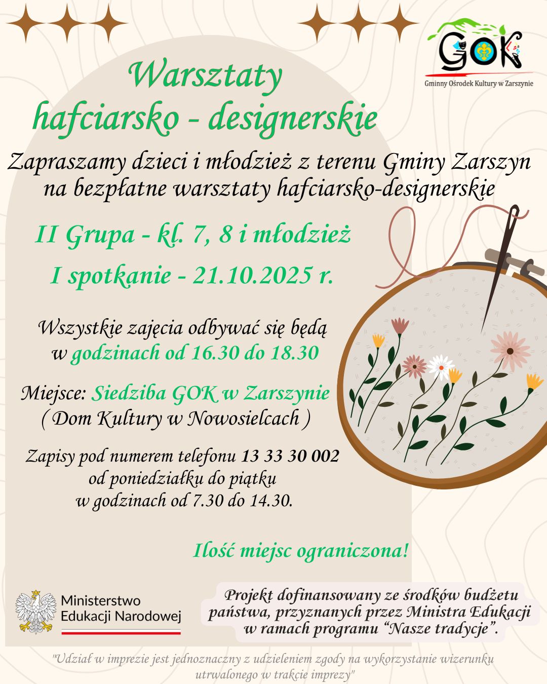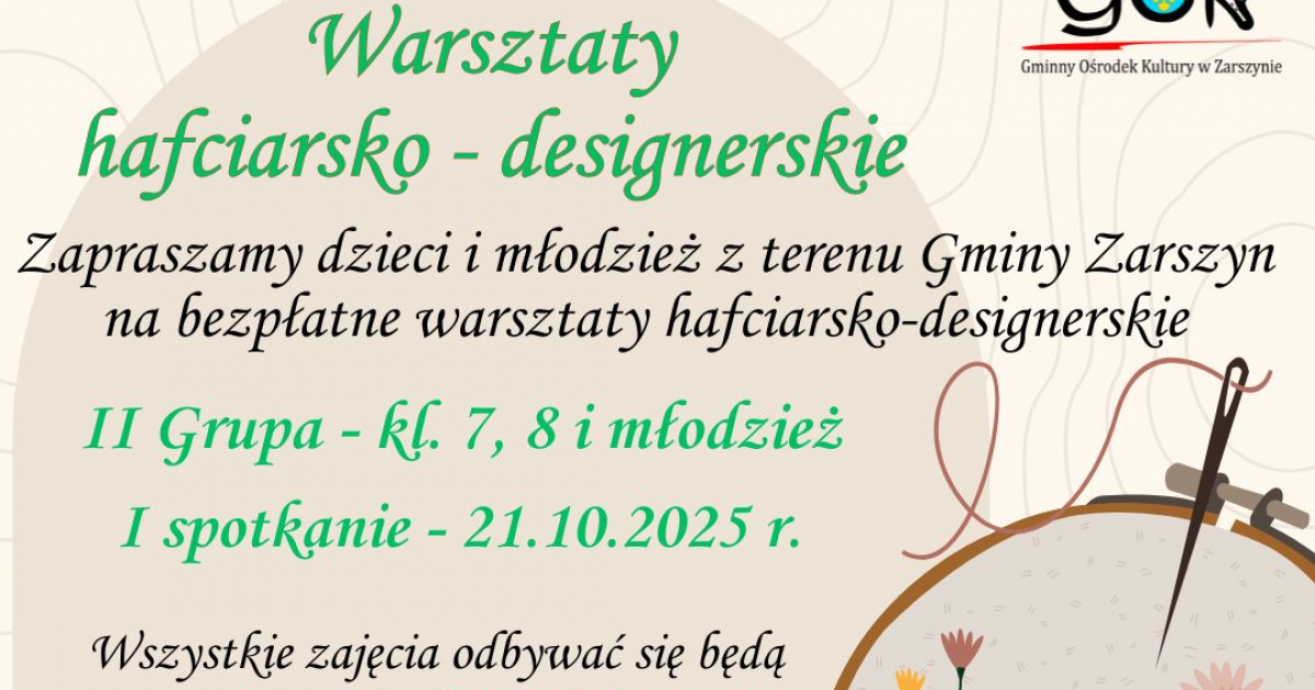 GMINA ZARSZYN: Nabór uczestników na bezpłatne „Warsztaty hafciarsko – designerskie”