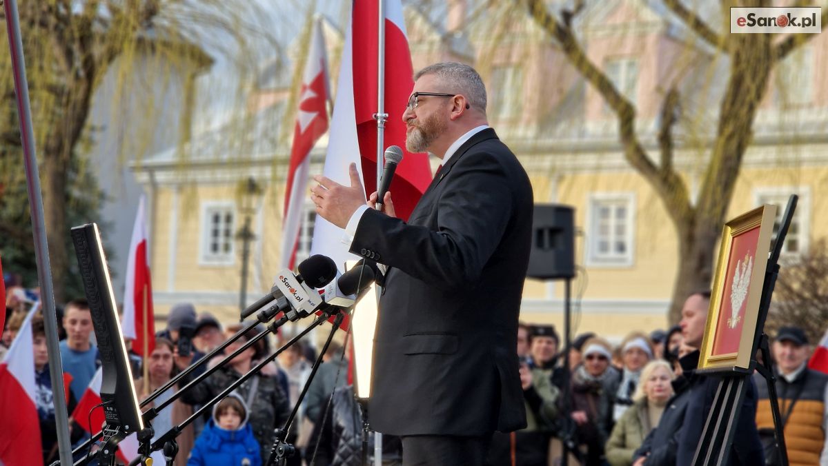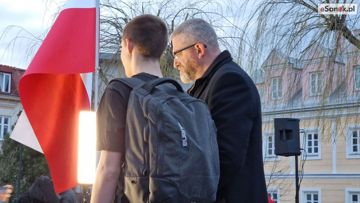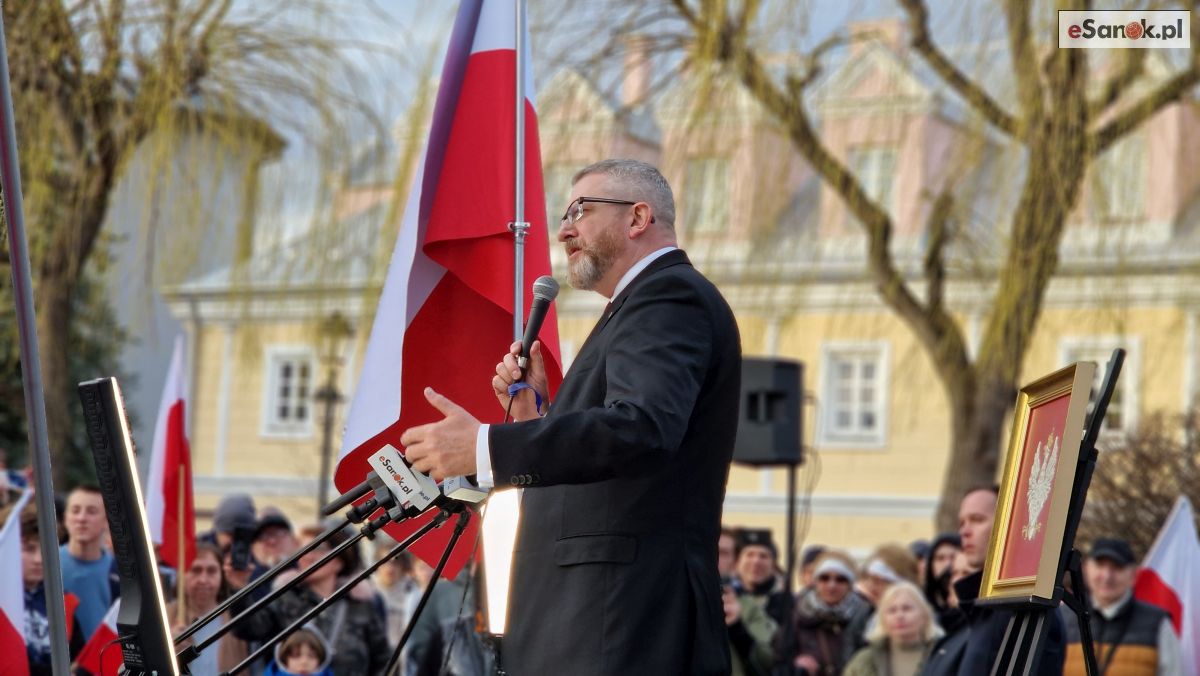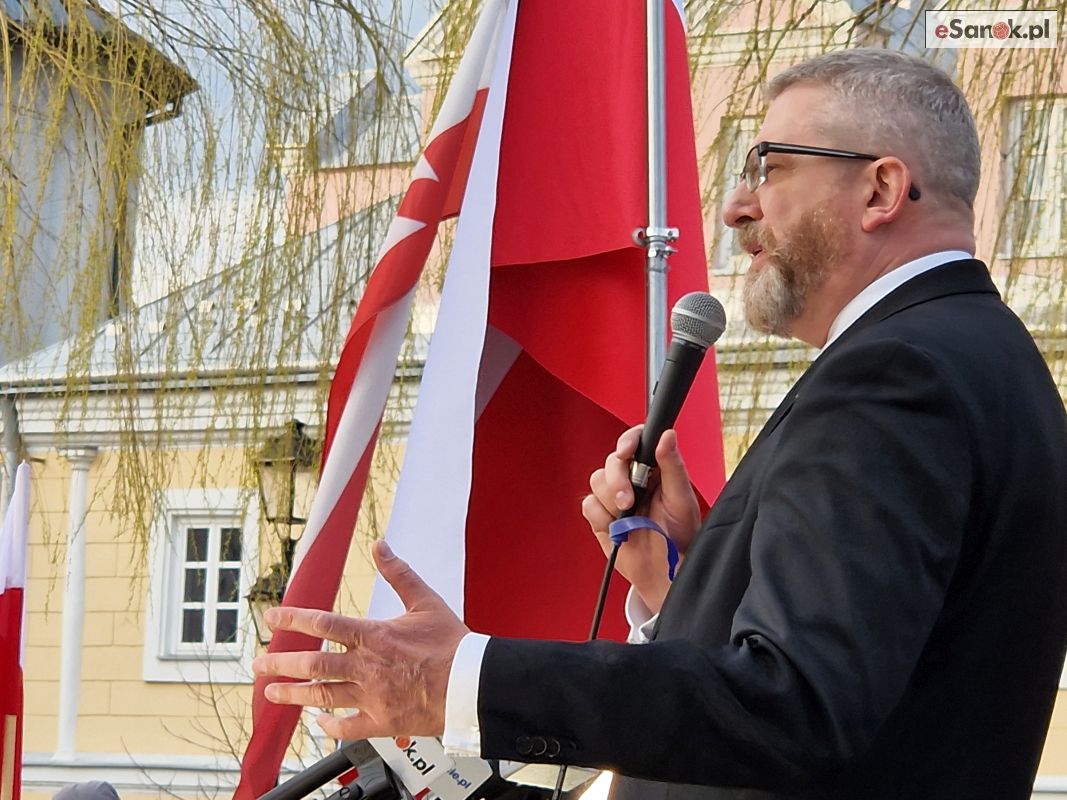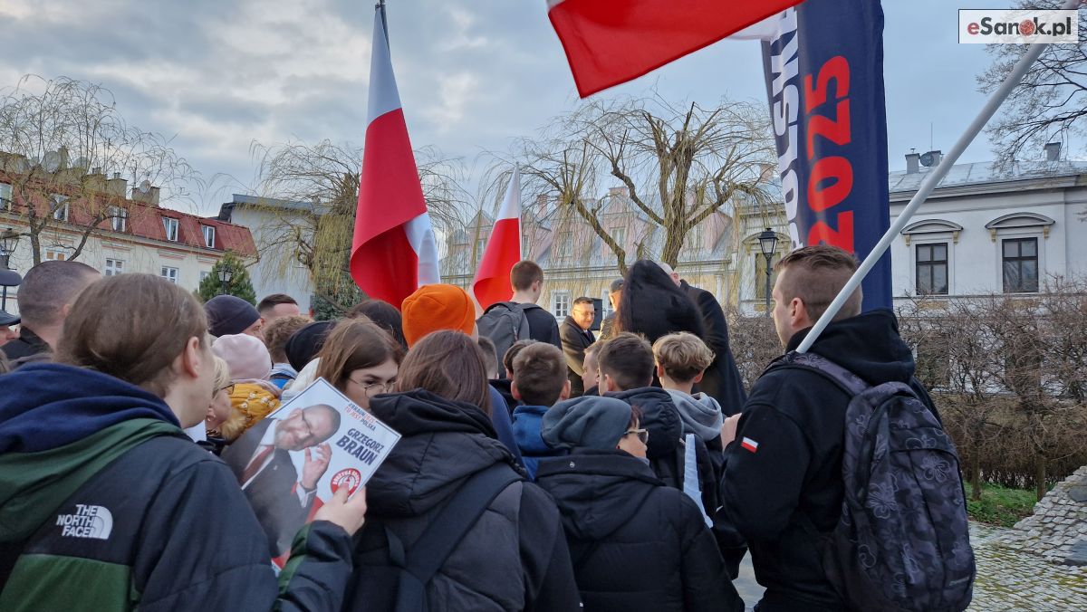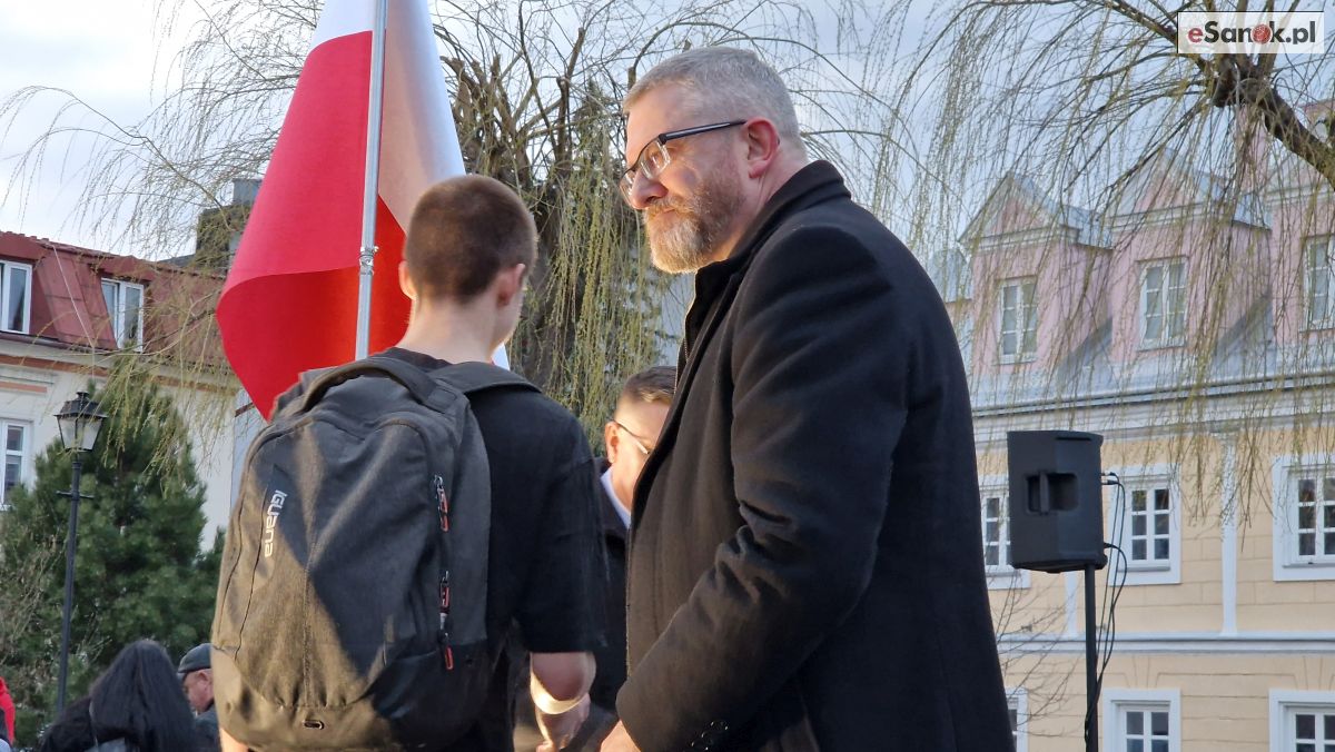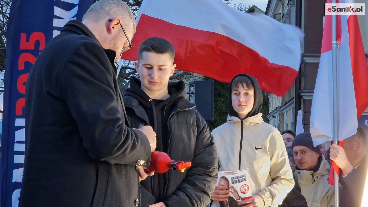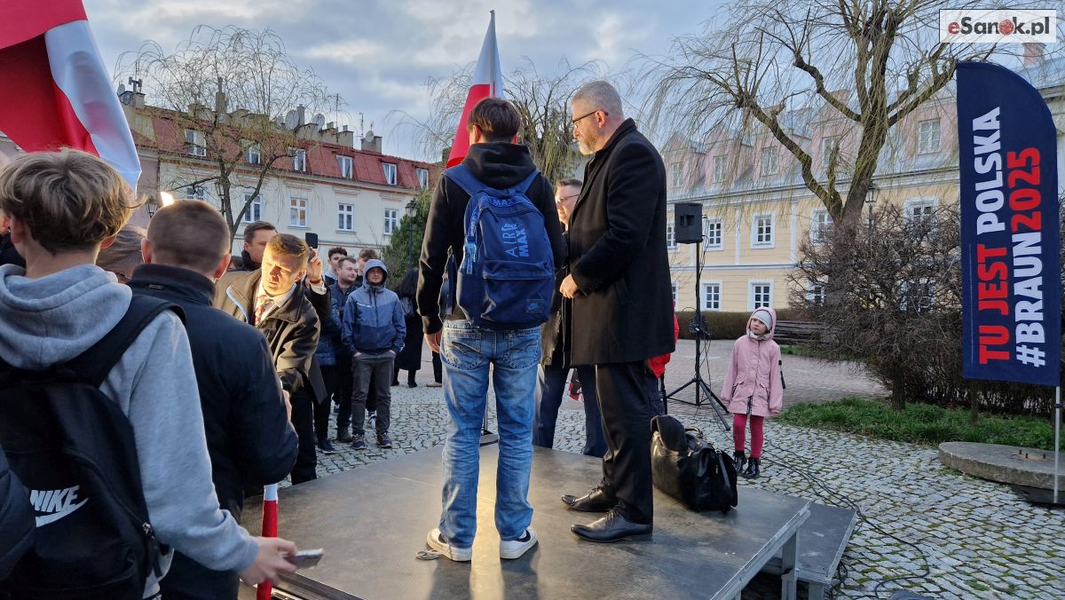 SANOK. W piątek, 28 marca br. mieszkańcy Sanoka mieli okazję spotkać się z kandydatem na prezydenta RP, Grzegorzem Braunem. Wydarzenie odbyło się na placu św. Jana, gdzie przed oficjalnym wystąpieniem kandydata, głos zabrali działacze związani z jego partią – Paweł Kuźma i Karolina Pikuła. To oni wprowadzili zebranych w tematykę spotkania, które było doskonałą okazją do poznania programu wyborczego Grzegorza Brauna.