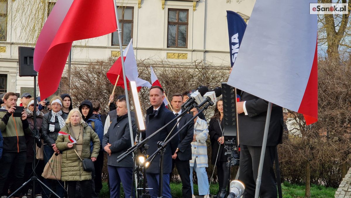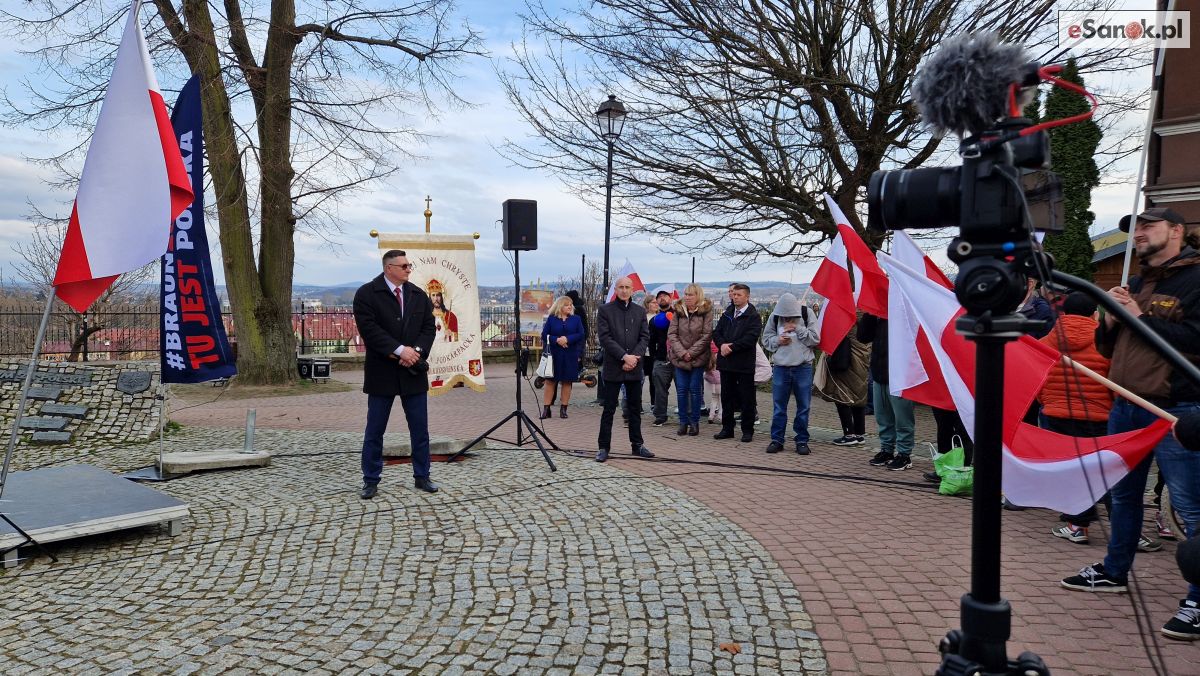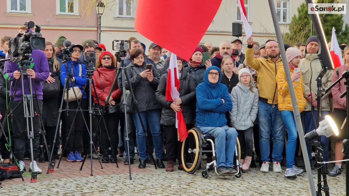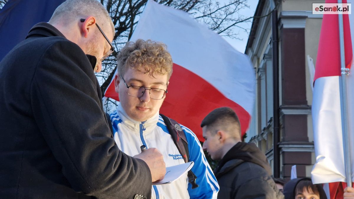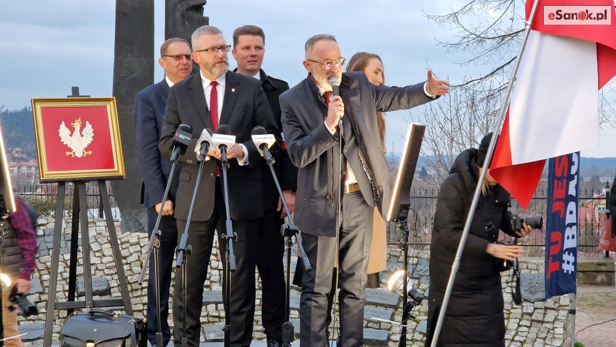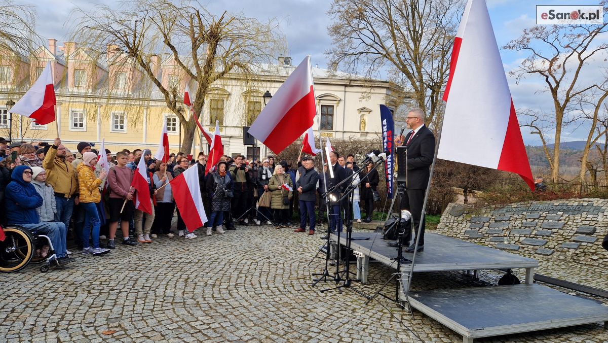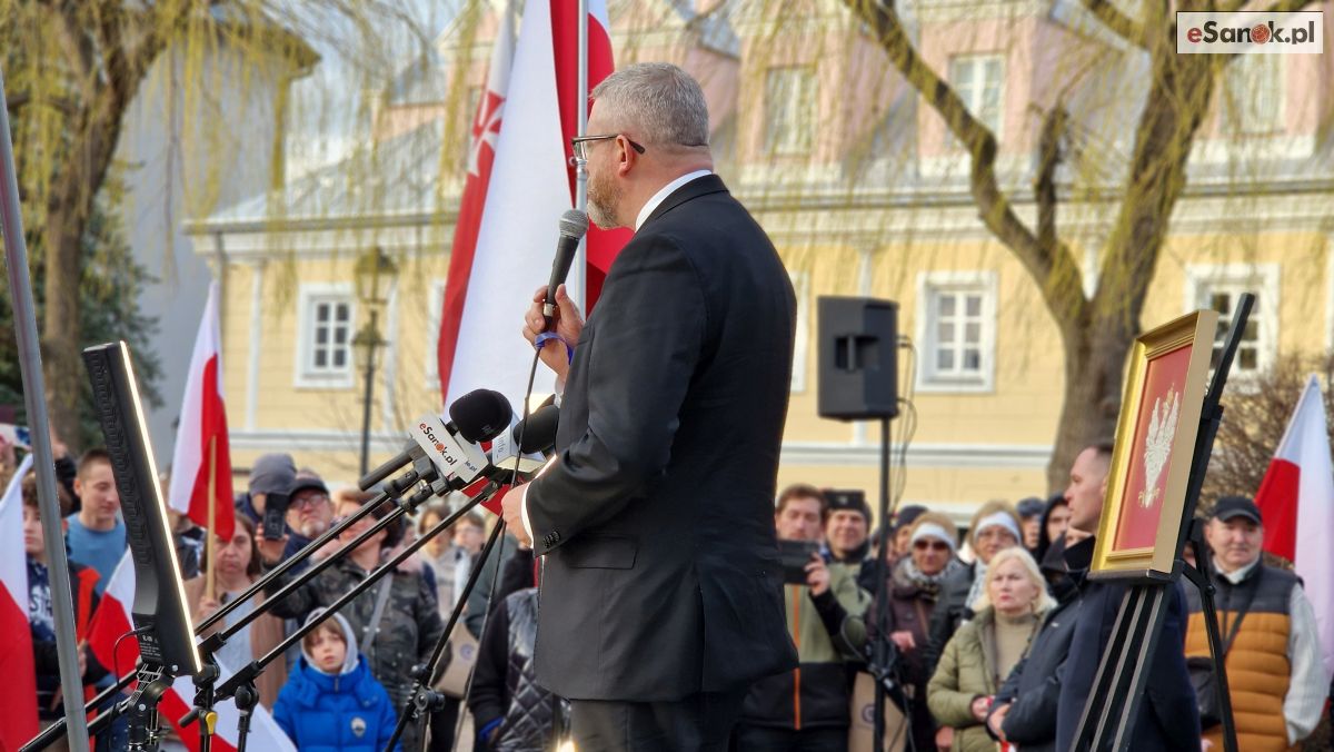 SANOK. W piątek, 28 marca br. mieszkańcy Sanoka mieli okazję spotkać się z kandydatem na prezydenta RP, Grzegorzem Braunem. Wydarzenie odbyło się na placu św. Jana, gdzie przed oficjalnym wystąpieniem kandydata, głos zabrali działacze związani z jego partią – Paweł Kuźma i Karolina Pikuła. To oni wprowadzili zebranych w tematykę spotkania, które było doskonałą okazją do poznania programu wyborczego Grzegorza Brauna.