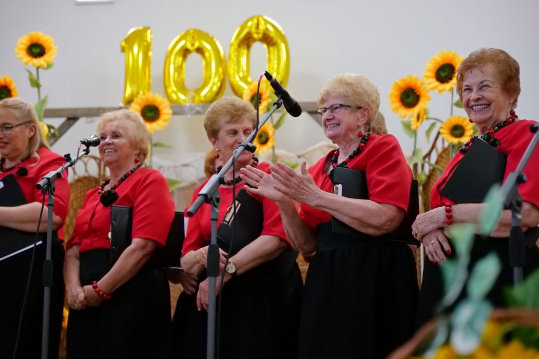 W szczególny sposób uhonorowano najstarsze członkinie, które od lat aktywnie działają na rzecz KGW Prusiek. Symboliczna czerwona róża oraz piosenka przygotowana specjalnie na tę okazję były wyrazem wdzięczności za ich wieloletnie zaangażowanie i pasję, które pozwoliły organizacji przetrwać przez całe stulecie.