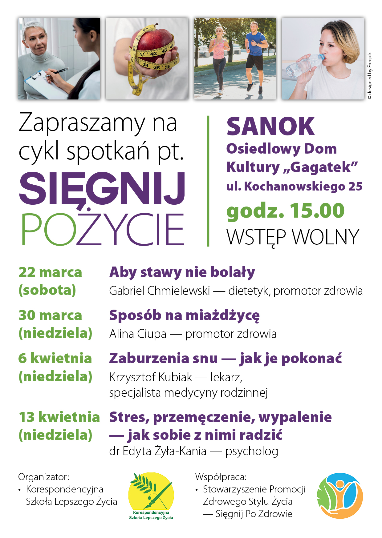 SANOK. W Osiedlowym Domu Kultury „Gagatek” w Sanoku od końca marca chętne osoby mogą korzystać z bezpłatnych wykładów ze specjalistami i pasjonatami zdrowego stylu życia. Organizatorem powyższej serii spotkań jest grupa wolontariuszy współpracujących z Korespondencyjną Szkołą Lepszego Życia oraz Stowarzyszeniem Promocji Zdrowego Stylu Życia – Sięgnij Po Zdrowie. Spotkania mają charakter niekomercyjny i są całkowicie darmowe. Ostatnim akordem tej serii będą warsztaty poruszające m.in. temat wypalenia.