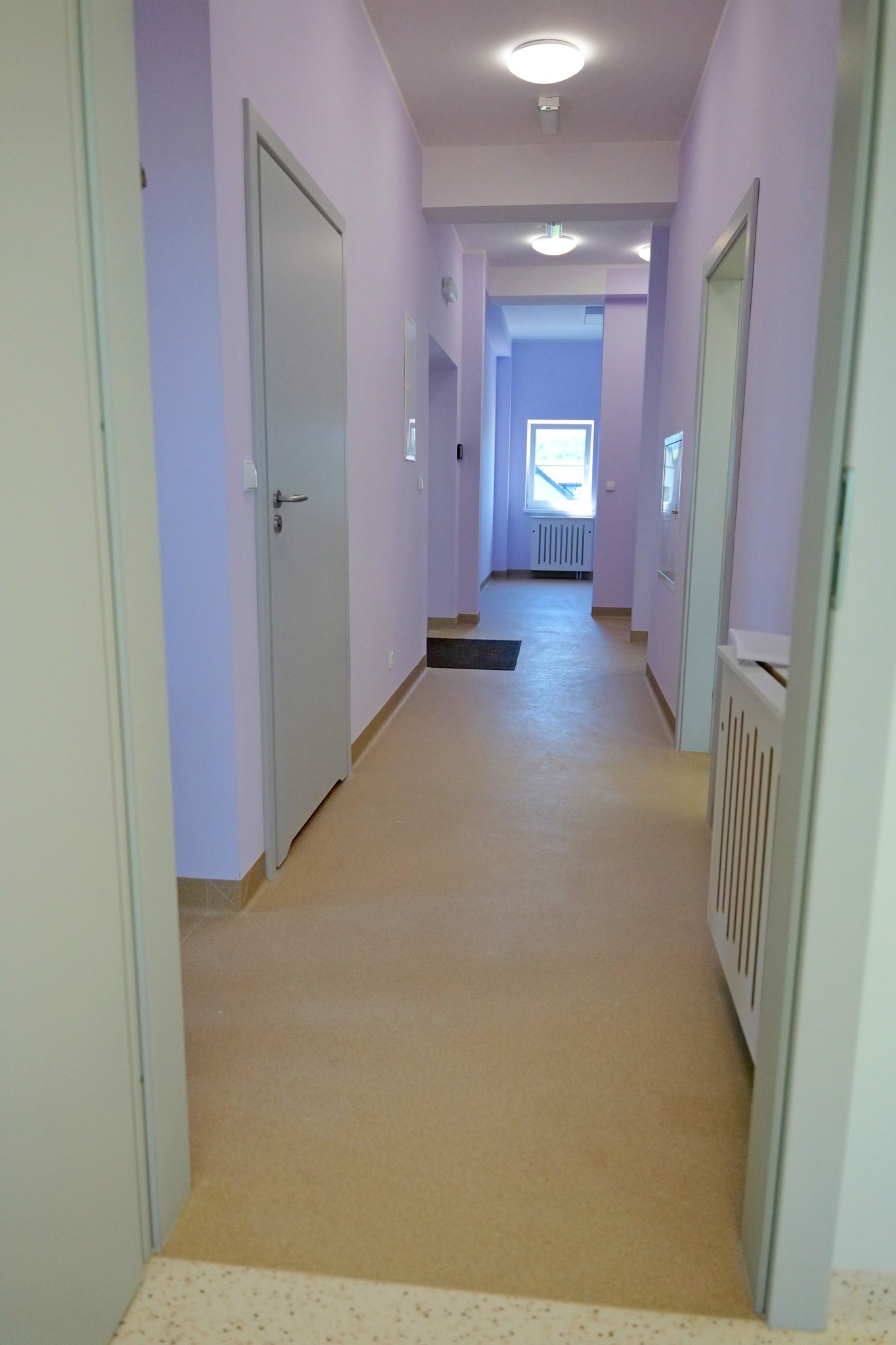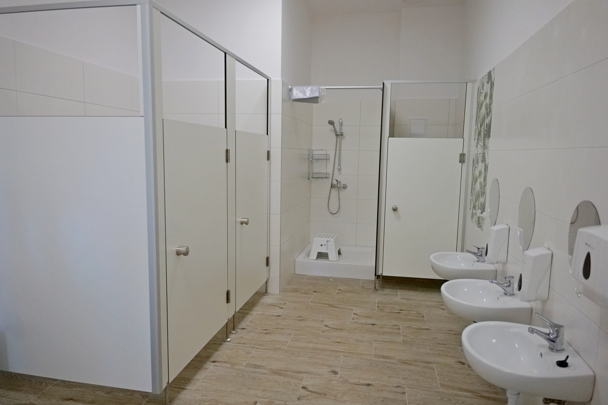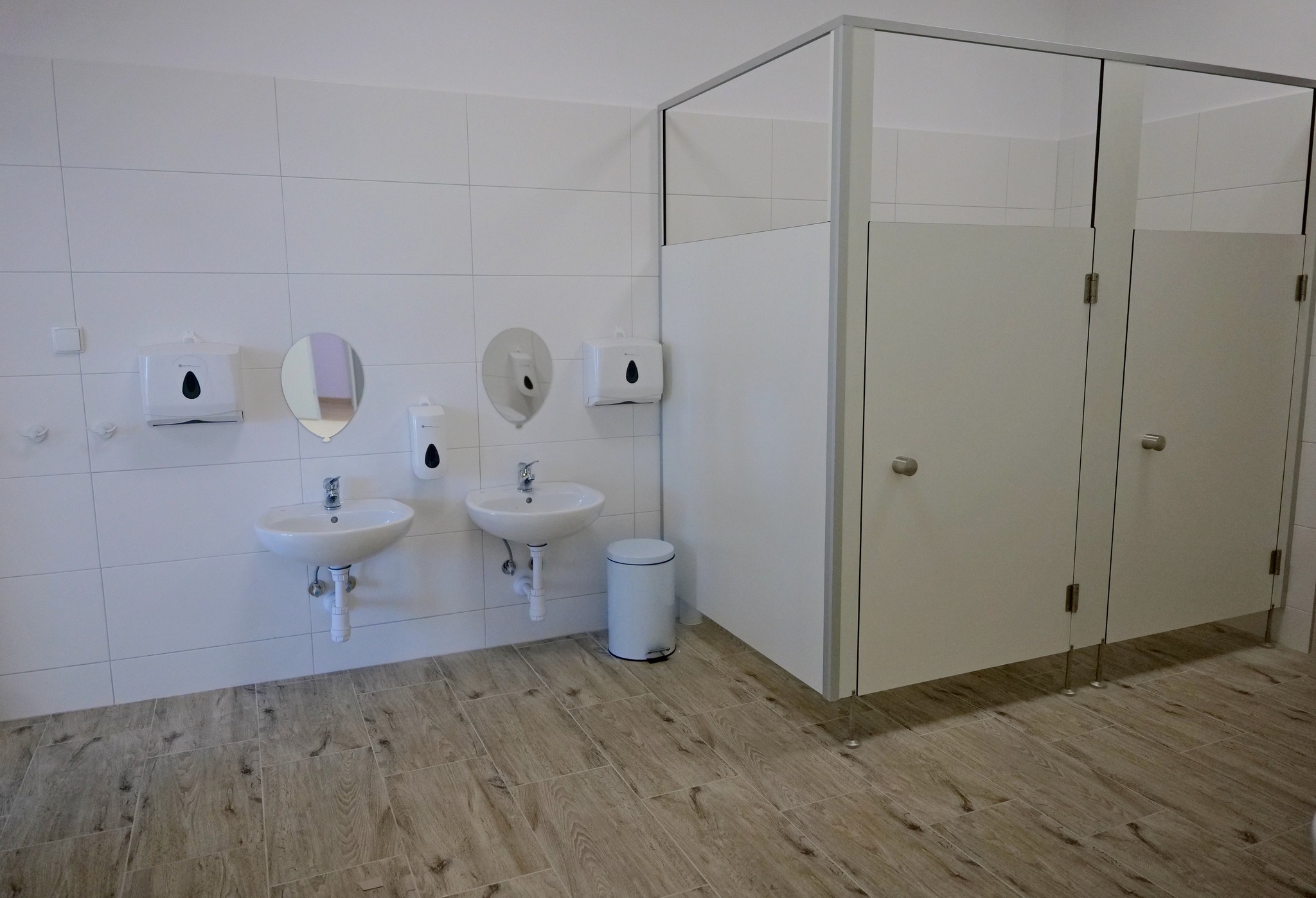 roboty wykończeniowe wewnętrzne, w tym wykonanie posadzek, malowanie ścian i sufitów, montaż wykładzin podłogowych oraz kompleksowe wyposażenie toalet (armatura sanitarna, kabiny HPL, stolarka drzwiowa),