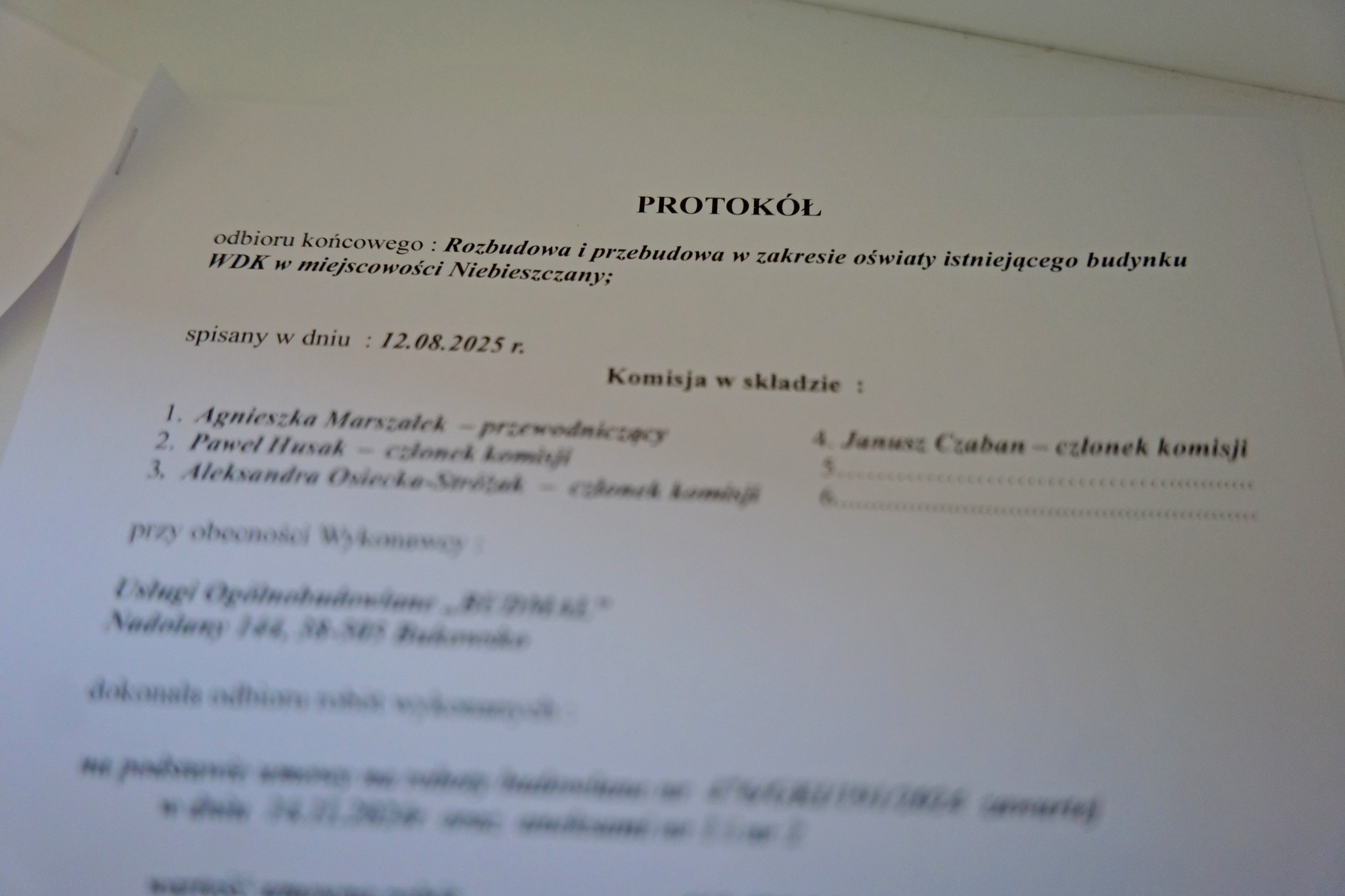 Odbioru końcowego dokonała komisja w składzie: Zastępca Wójta Agnieszka Marszałek, radny Janusz Czaban, pracownicy Referatu Gospodarki Komunalnej i Inwestycji Paweł Husak i Aleksandra Osiecka-Stróżak, a także wykonawca – firma Usługi Ogólnobudowlane „BUDMAL” z siedzibą w Nadolany 144, 38-505 Bukowsko, reprezentowana przez Pawła Kocana.