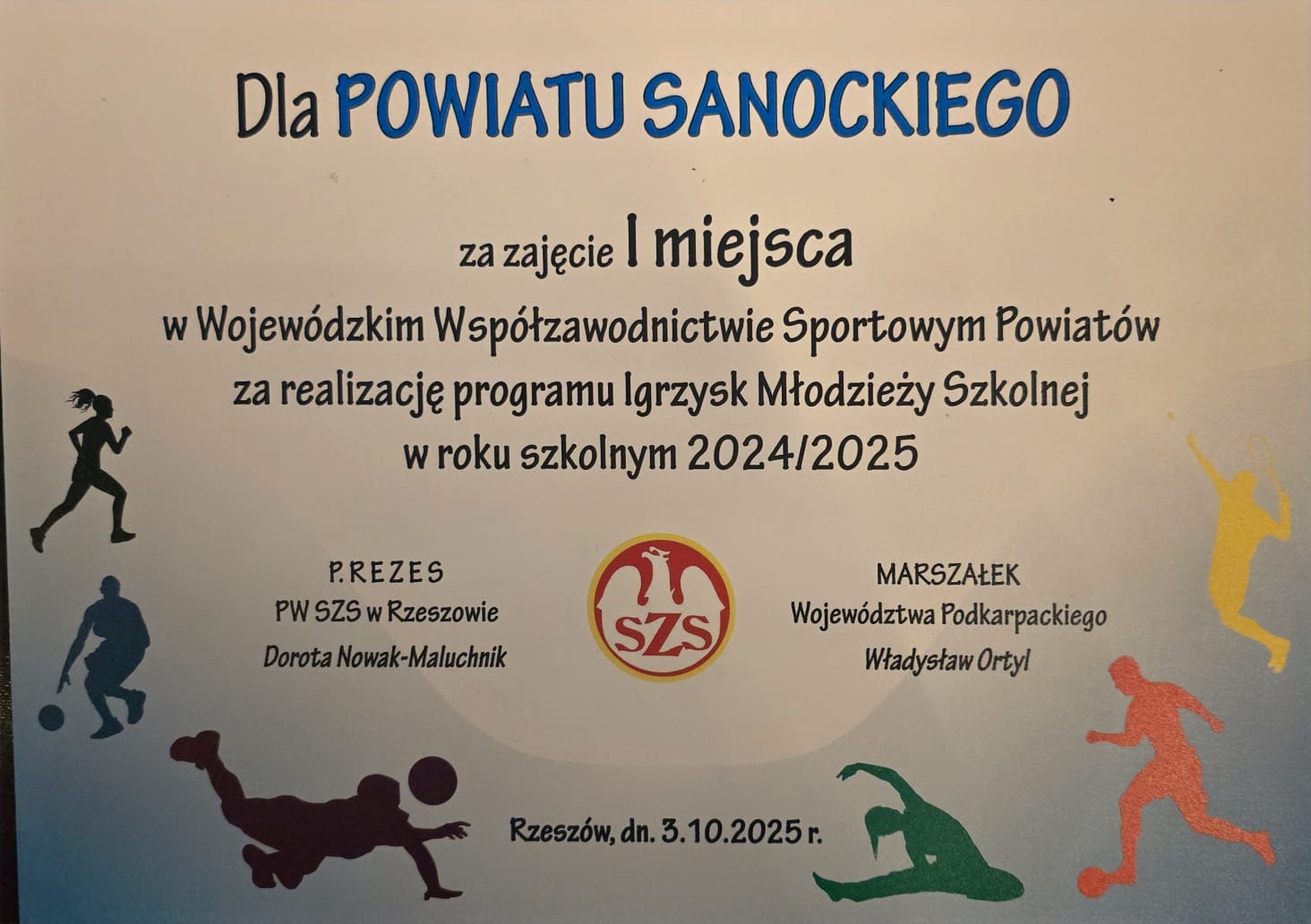 Powiat sanocki w kategorii Igrzyska Młodzieży Szkolnej zdobył I miejsce. To ogromne wyróżnienie dla utalentowanych młodych sportowców ze wszystkich szkół gmin i miast powiatu sanockiego, nauczycieli wychowania fizycznego, trenerów. Miasto Sanok w klasyfikacji gmin za realizację programu Wojewódzkich Igrzysk Młodzieży Szkolnej zajęło II miejsce! Gratulujemy!