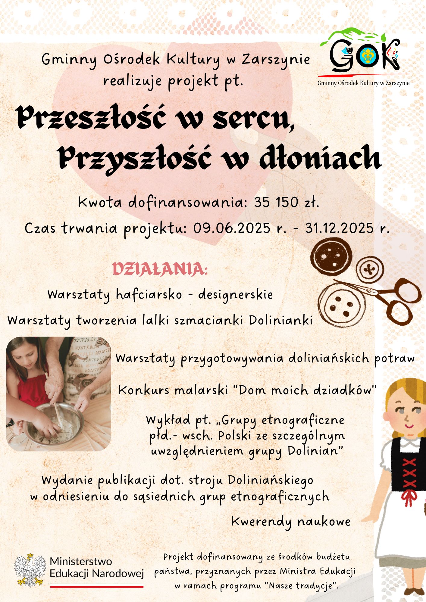 Gminny Ośrodek Kultury w Zarszynie rozpoczął realizację projektu pn. „Przeszłość w sercu, przyszłość w dłoniach”, dofinansowanego ze środków budżetu państwa przyznanych przez Ministra Edukacji w ramach programu „Nasze tradycje”.