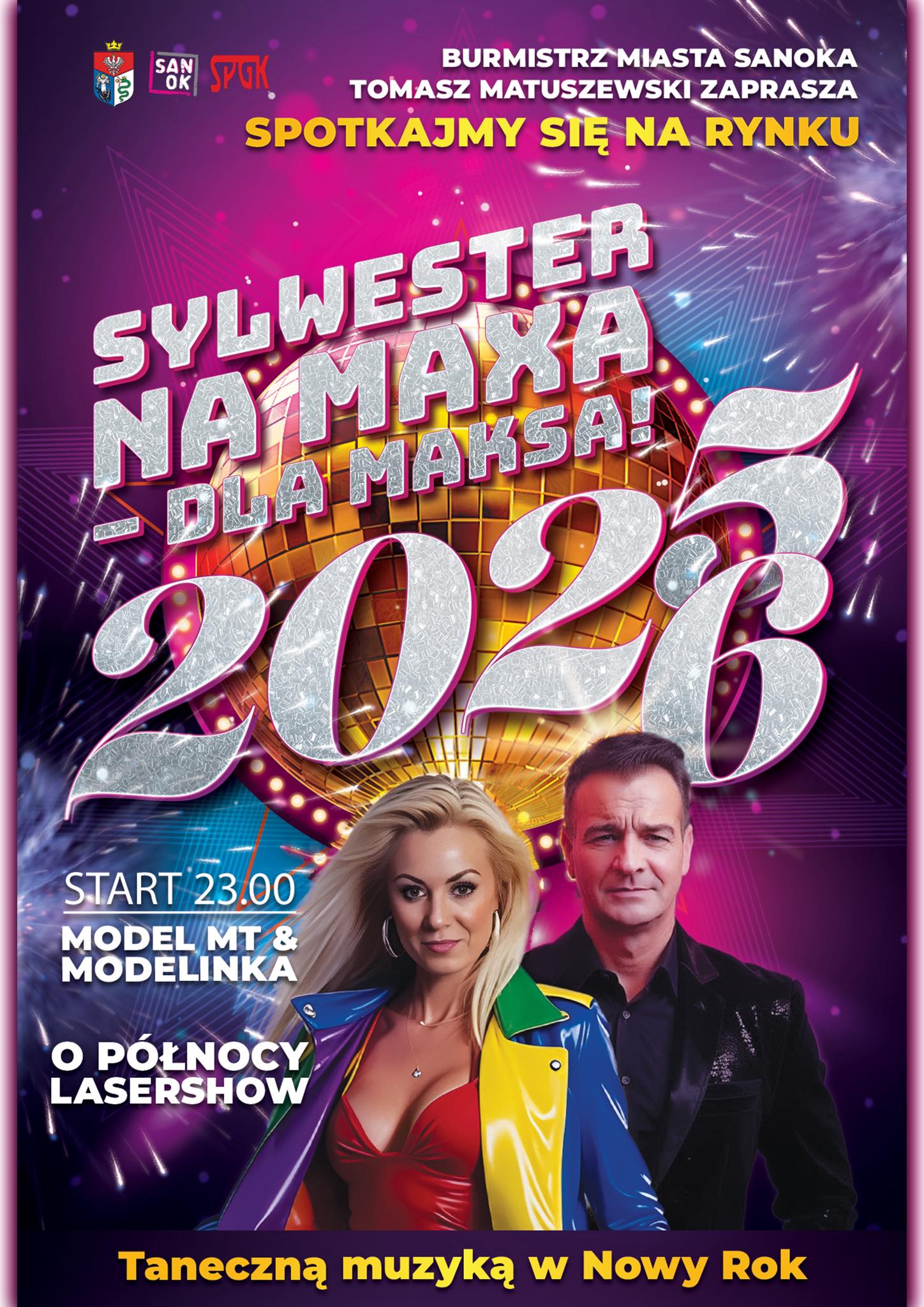 Wspólne powitanie Nowego Roku rozpocznie się o godzinie 22.00. Rynek wypełni się sylwestrową atmosferą, a o 23.00 na scenie wystąpi zespół Model MT & Modelinka, który poprowadzi uczestników przez ostatnie chwile starego roku. Tuż przed północą zaplanowano noworoczne życzenia, a punktualnie o 00.00 niebo nad Sanokiem rozświetli pokaz laserowy – zapowiadany jako jedno z najbardziej efektownych widowisk tego typu w historii miasta.