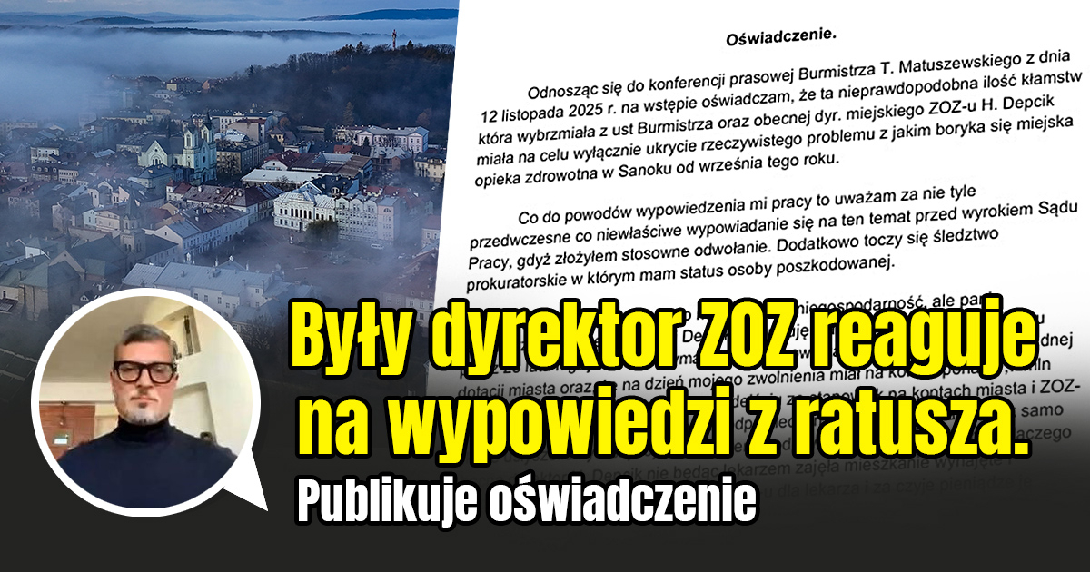 W mediach społecznościowych profilu Transparenty Sanok ukazało się oświadczenie Aleksandra Korobczenki, byłego dyrektora Miejskiego ZOZ w Sanoku. Dokument stanowi bezpośrednią odpowiedź na słowa burmistrza Tomasza Matuszewskiego oraz obecnej dyrektor placówki, Haliny Depcik, wygłoszone podczas konferencji prasowej 12 listopada.