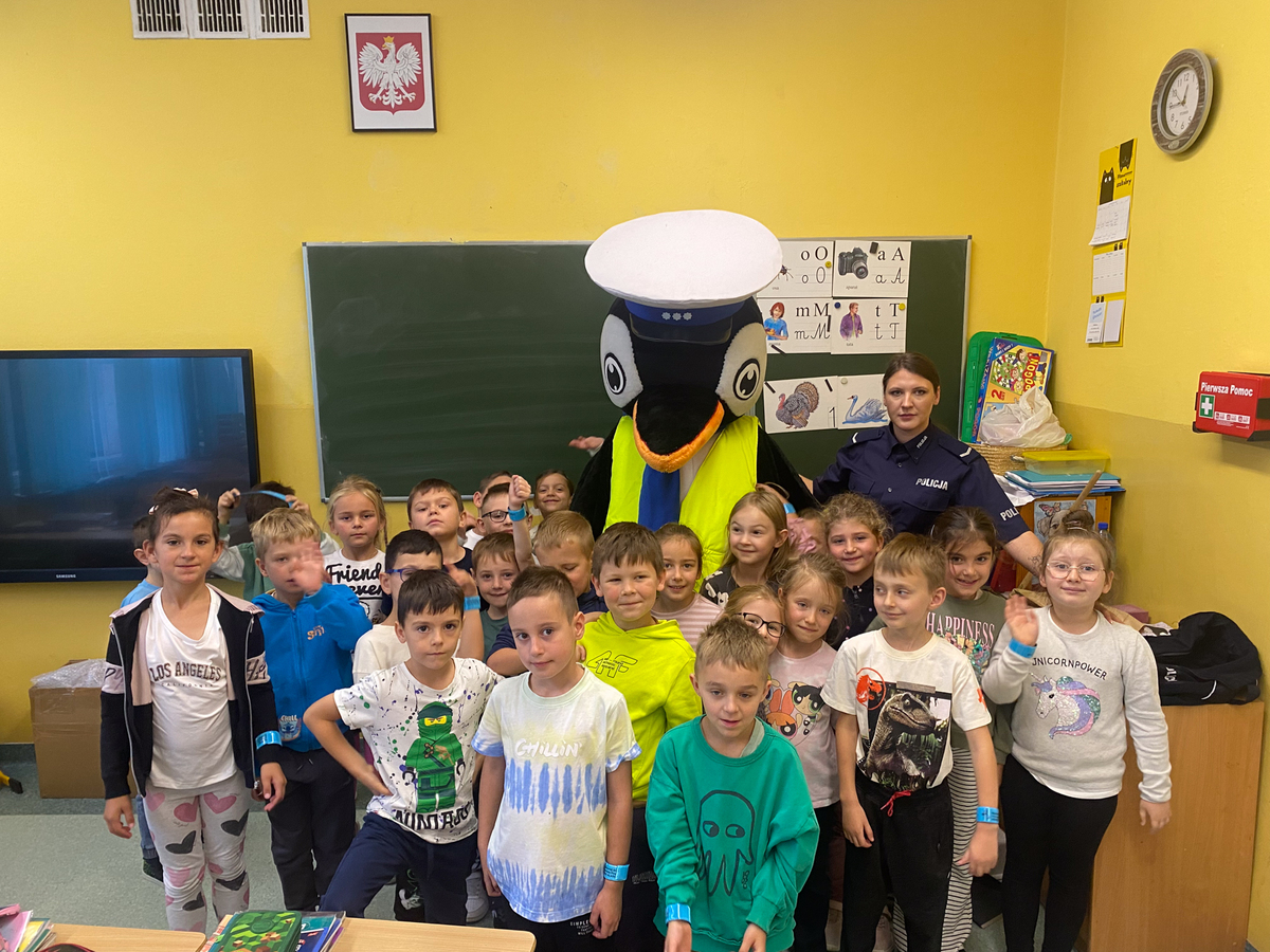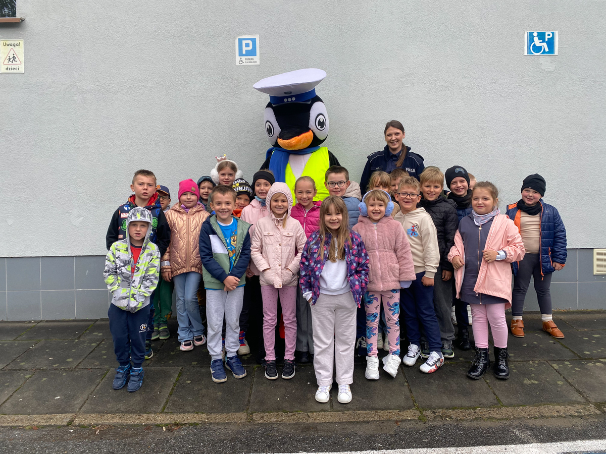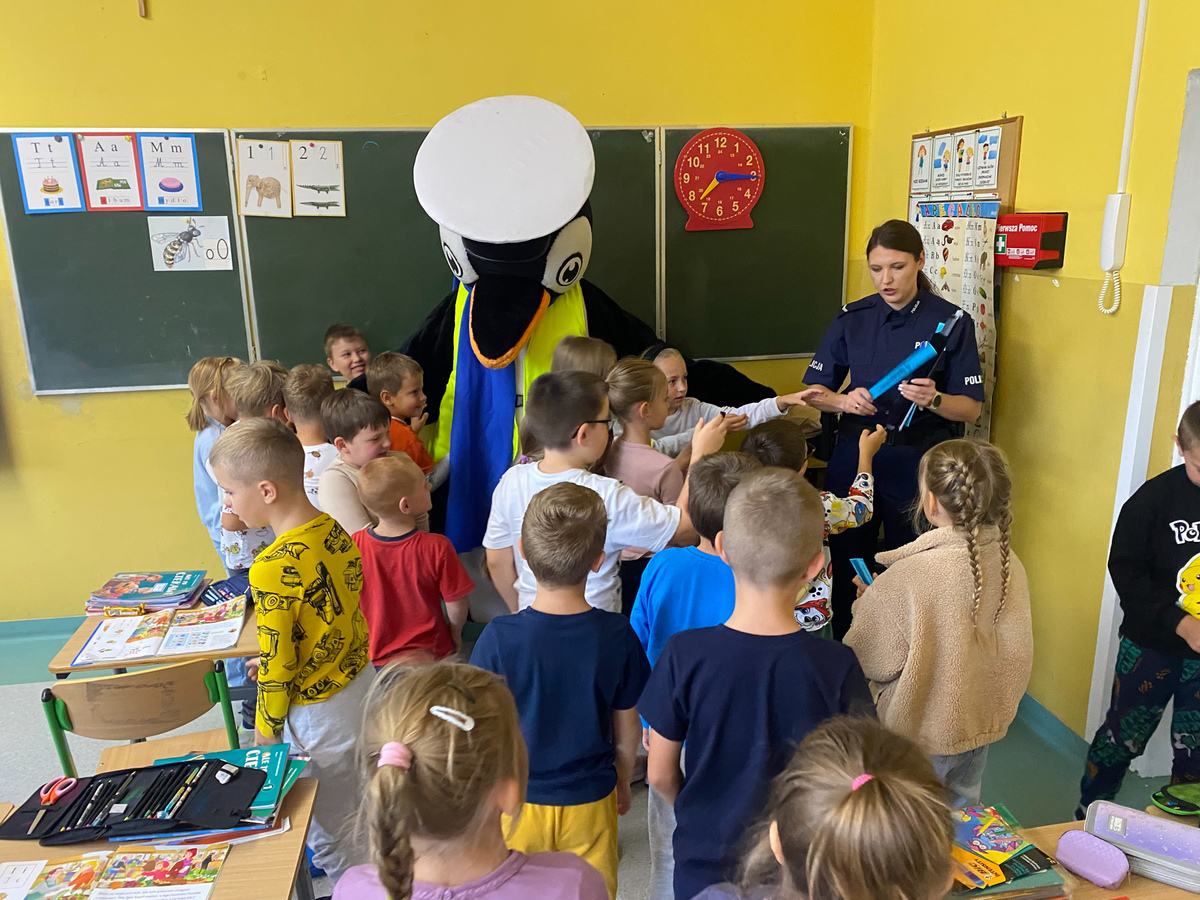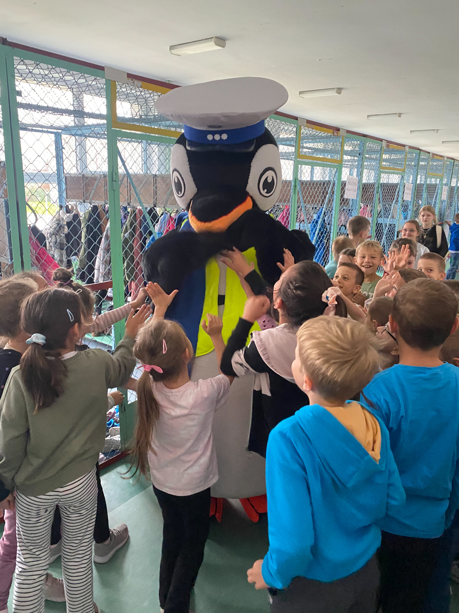SANOK: Policjanci dbają o bezpieczeństwo najmłodszych. Pomaga im pingwin Stefan