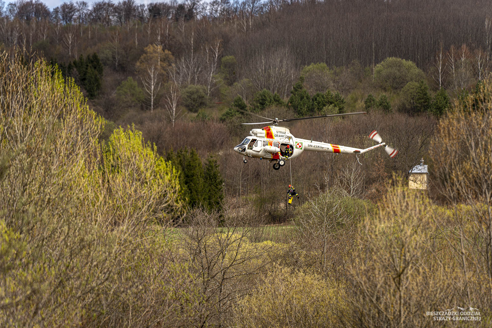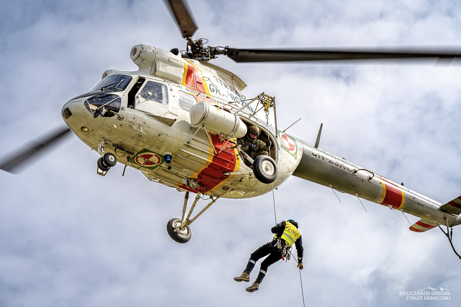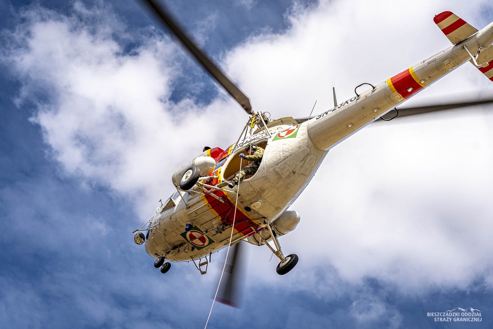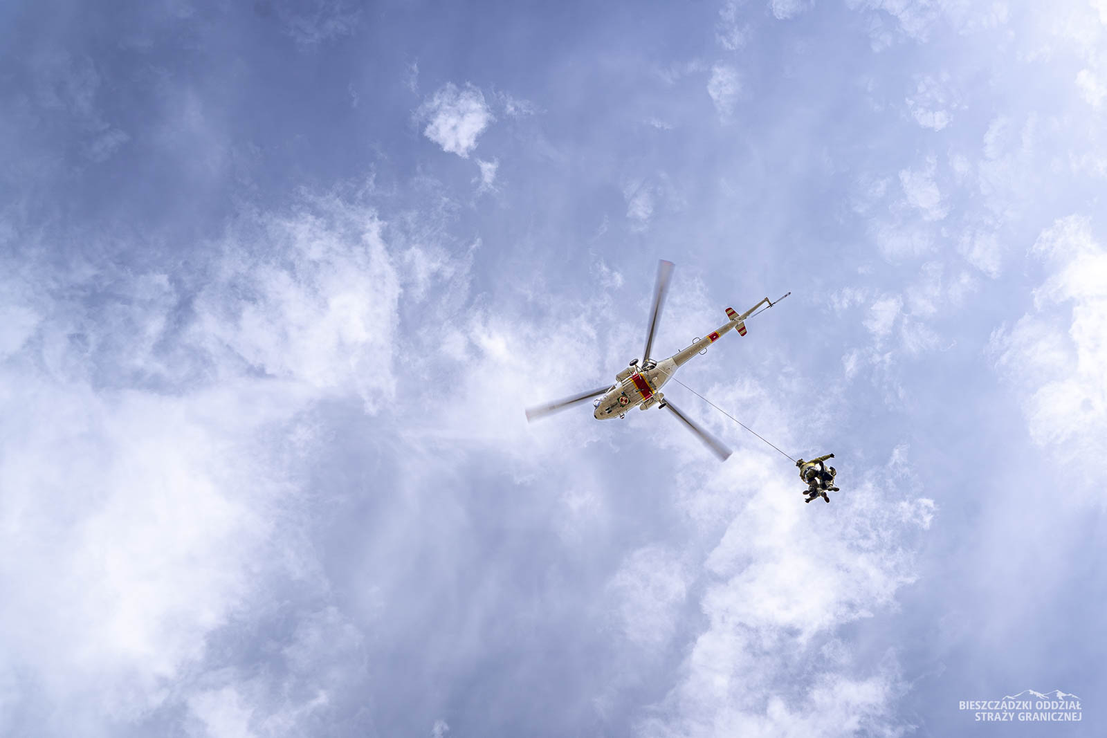 BIESZCZADY. W okolicach Huwnik i Arłamowa funkcjonariusze Straży Granicznej, Państwowej Straży Pożarnej i ratownicy Bieszczadzkiego GOPR-u szlifowali umiejętności wykorzystania technik ratowniczych z udziałem śmigłowca SG.