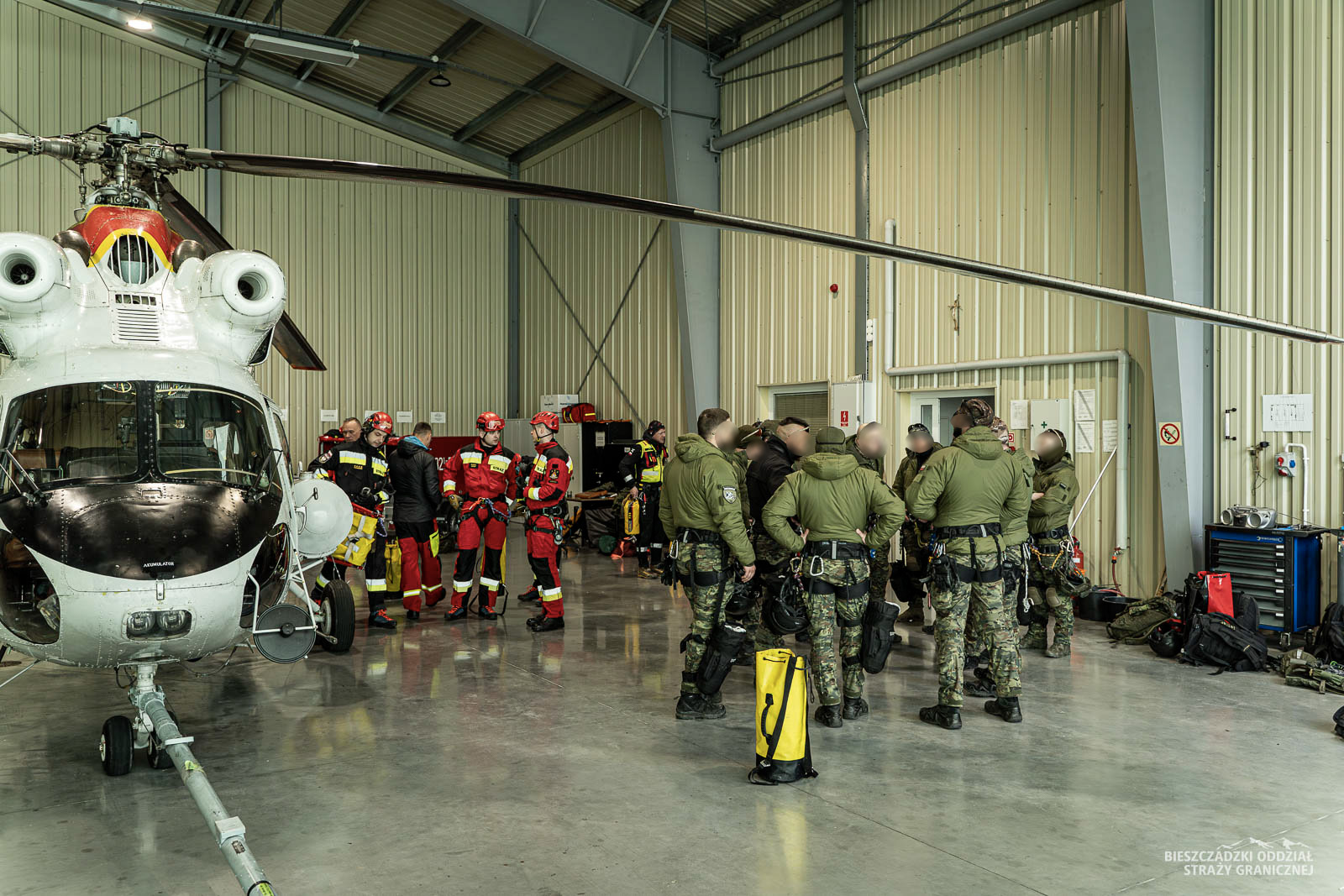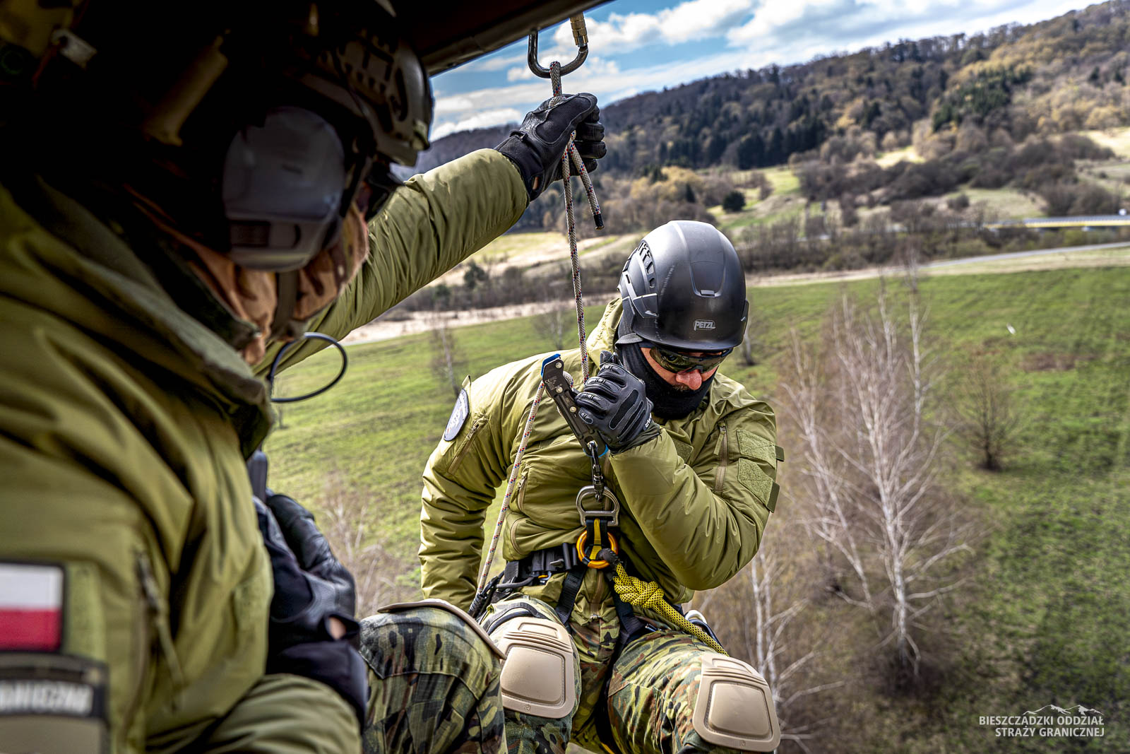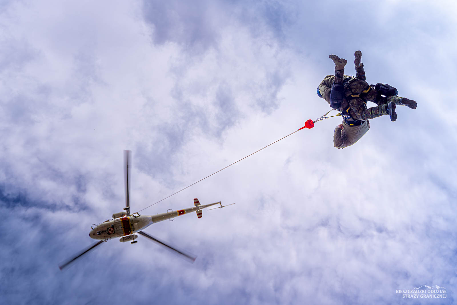 BIESZCZADY. W okolicach Huwnik i Arłamowa funkcjonariusze Straży Granicznej, Państwowej Straży Pożarnej i ratownicy Bieszczadzkiego GOPR-u szlifowali umiejętności wykorzystania technik ratowniczych z udziałem śmigłowca SG.