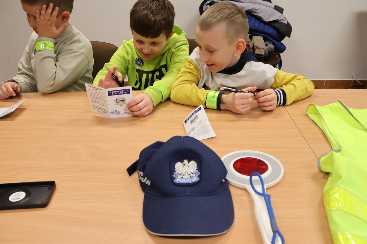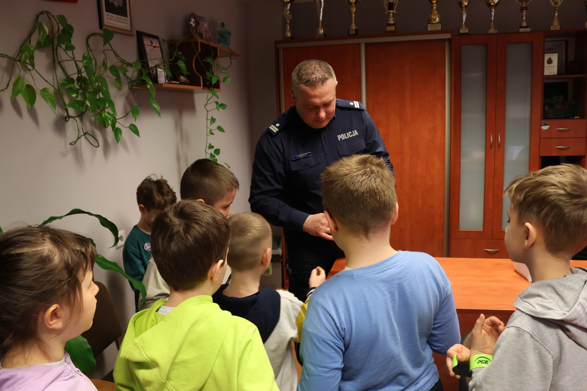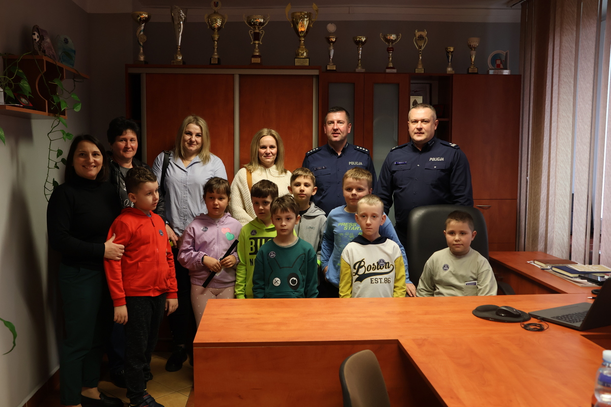 Na zakończenie wizyty, Komendant Powiatowy Policji w Ustrzykach Dolnych podinsp. Robert Gęborys wspólnie z I Zastępcą nadkom. Marcinem Podkalickim, przyjął miłych gości w swoim gabinecie. Każdy z uczniów otrzymał od nich drobne upominki – m.in. elementy odblaskowe.