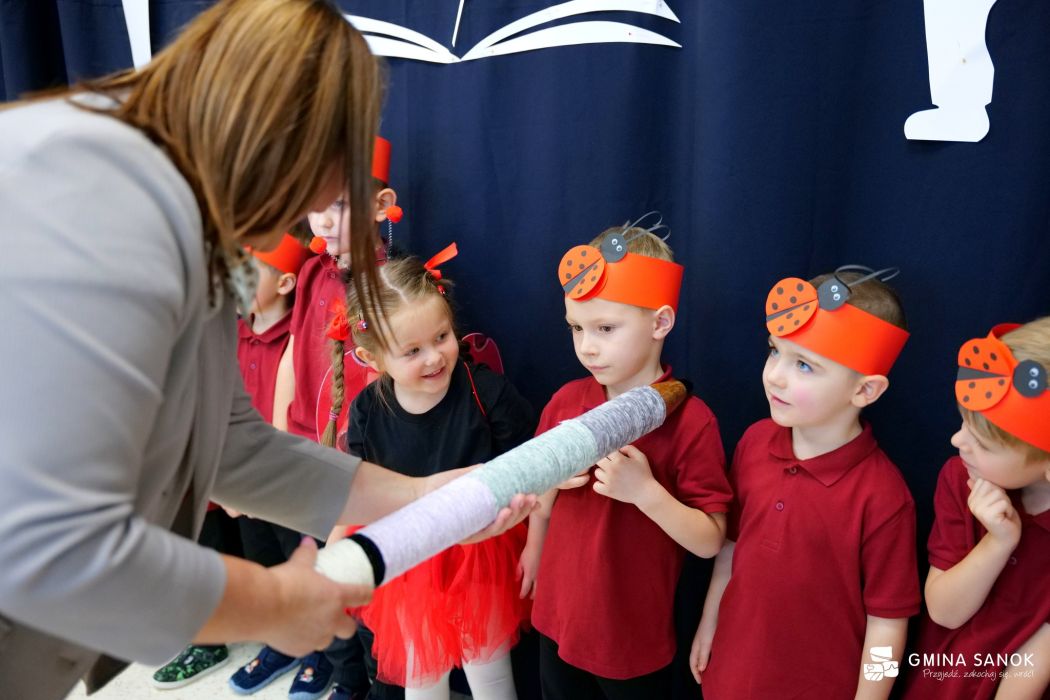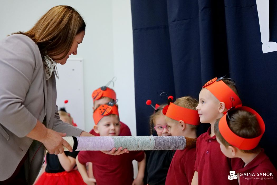 Najważniejszym punktem uroczystości był akt pasowania, którego dokonała dyrektor przedszkola, Małgorzata Śliwiak. Symbolicznie dotykając ramienia każdego dziecka kolorowym ołówkiem, przyjęła je do grona przedszkolnej społeczności.
