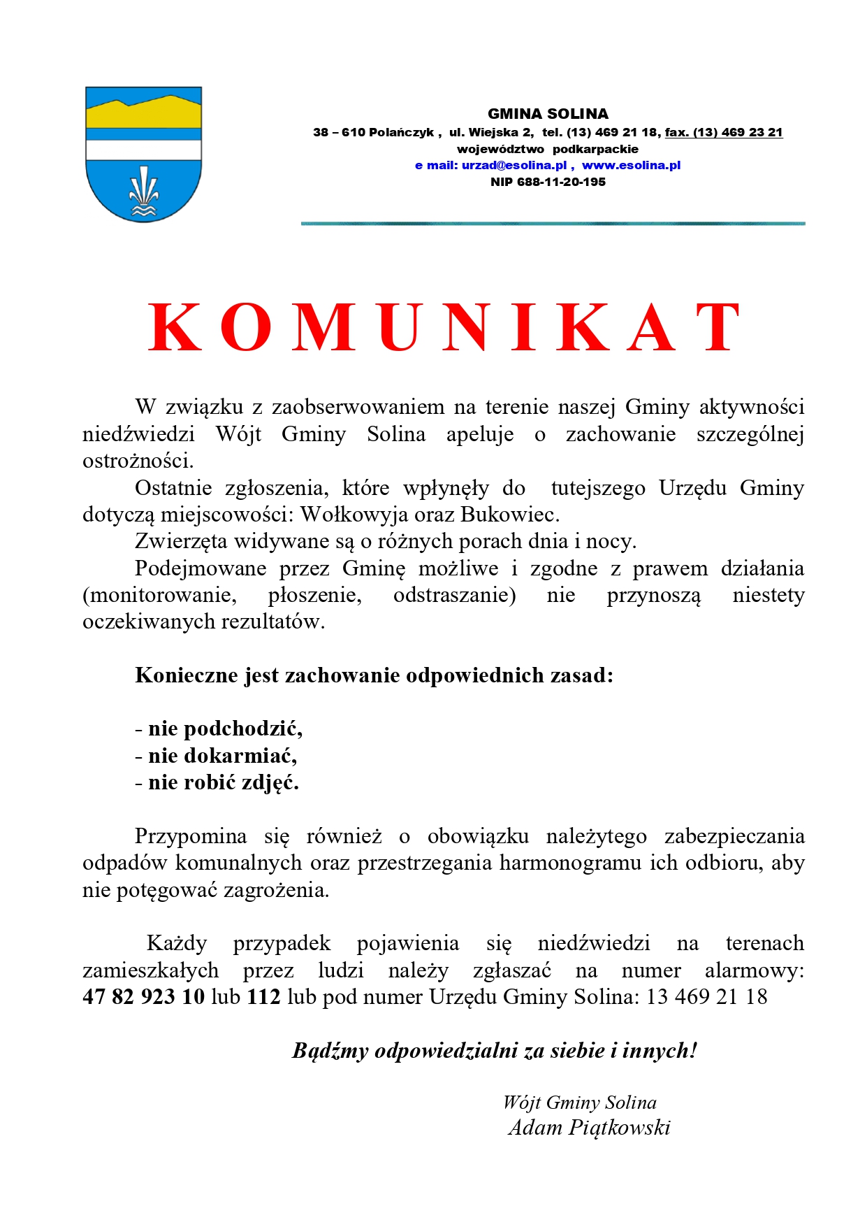 Wójt zwraca również uwagę na kluczowy aspekt: odpady komunalne. Resztki jedzenia w niezabezpieczonych kubłach działają na niedźwiedzie jak magnes. Mieszkańcy są proszeni o należyte zabezpieczanie śmieci i ścisłe przestrzeganie harmonogramu ich odbioru.