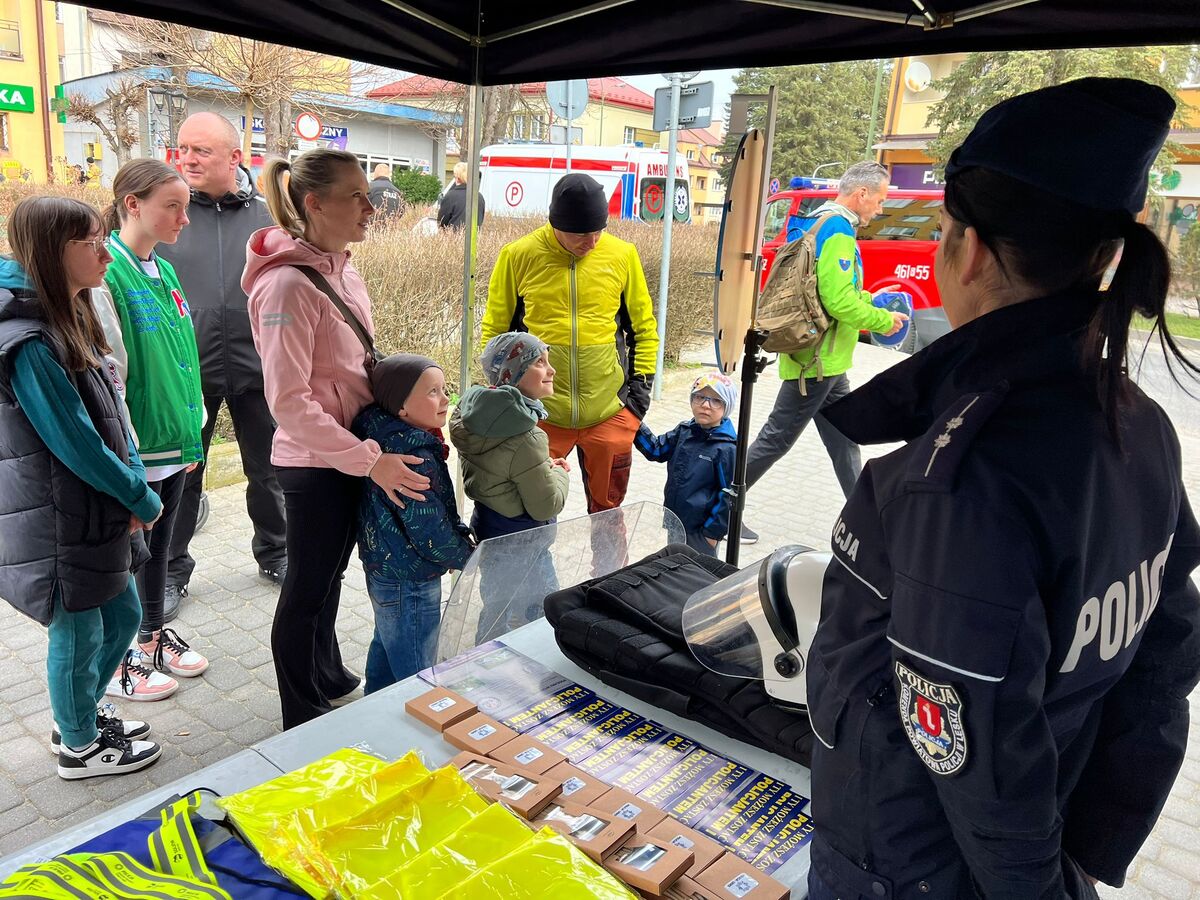 Najmłodsi uczestnicy mieli okazję sprawdzić swoją wiedzę z zakresu bezpieczeństwa, natomiast starsi otrzymywali materiały informacyjne i zadawali pytania dotyczące codziennej służby.