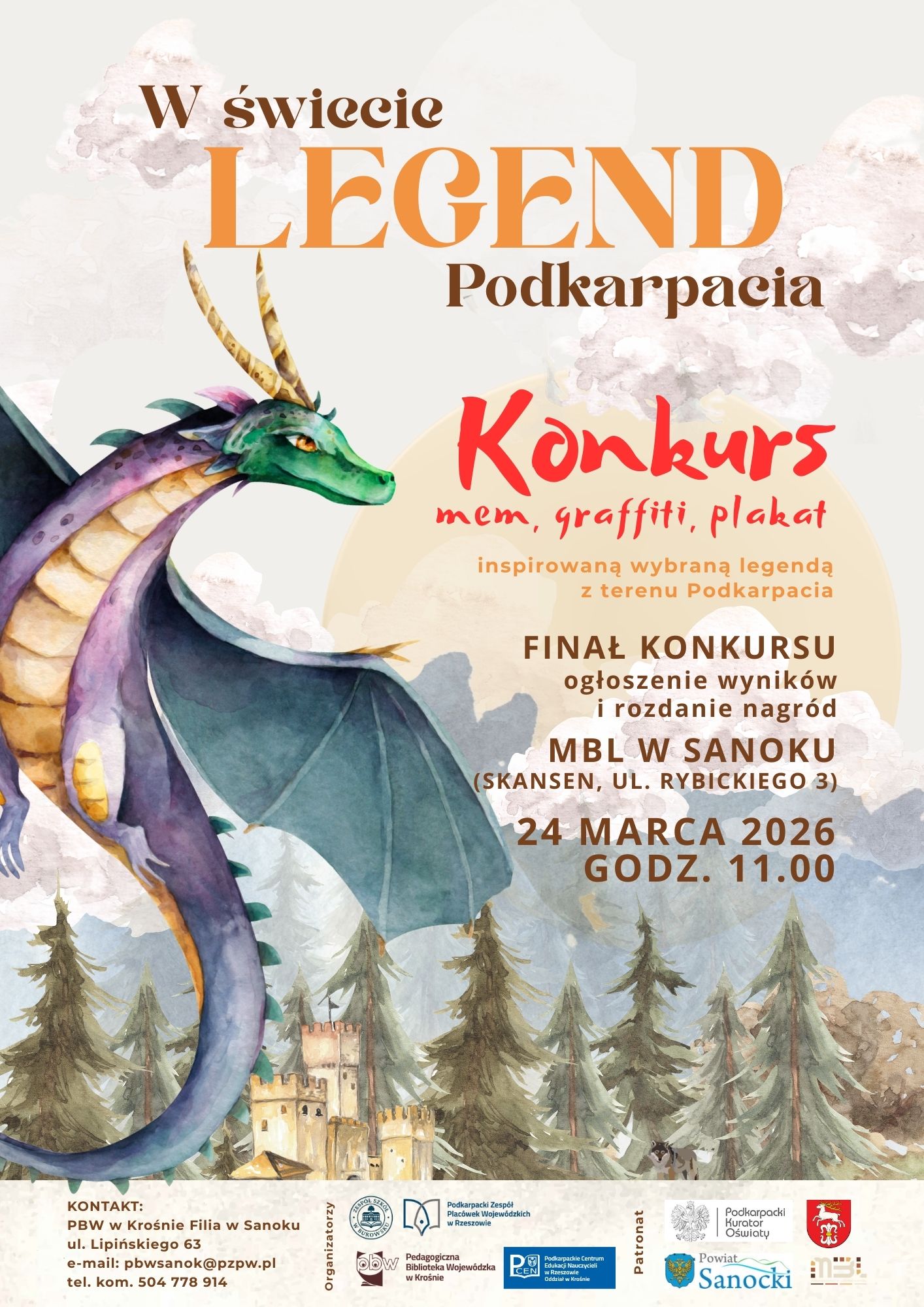 Uroczyste wręczenie nagród odbędzie się 24 marca o godzinie 11.00 w sanockim Skansenie. Podczas wydarzenia świat legend przybliży nam znany kulturoznawca, autor książek regionalnych, przewodnik – Robert Bańkosz. Serdecznie zapraszamy uczestników konkursu wraz z opiekunami do udziału w tym wydarzeniu.