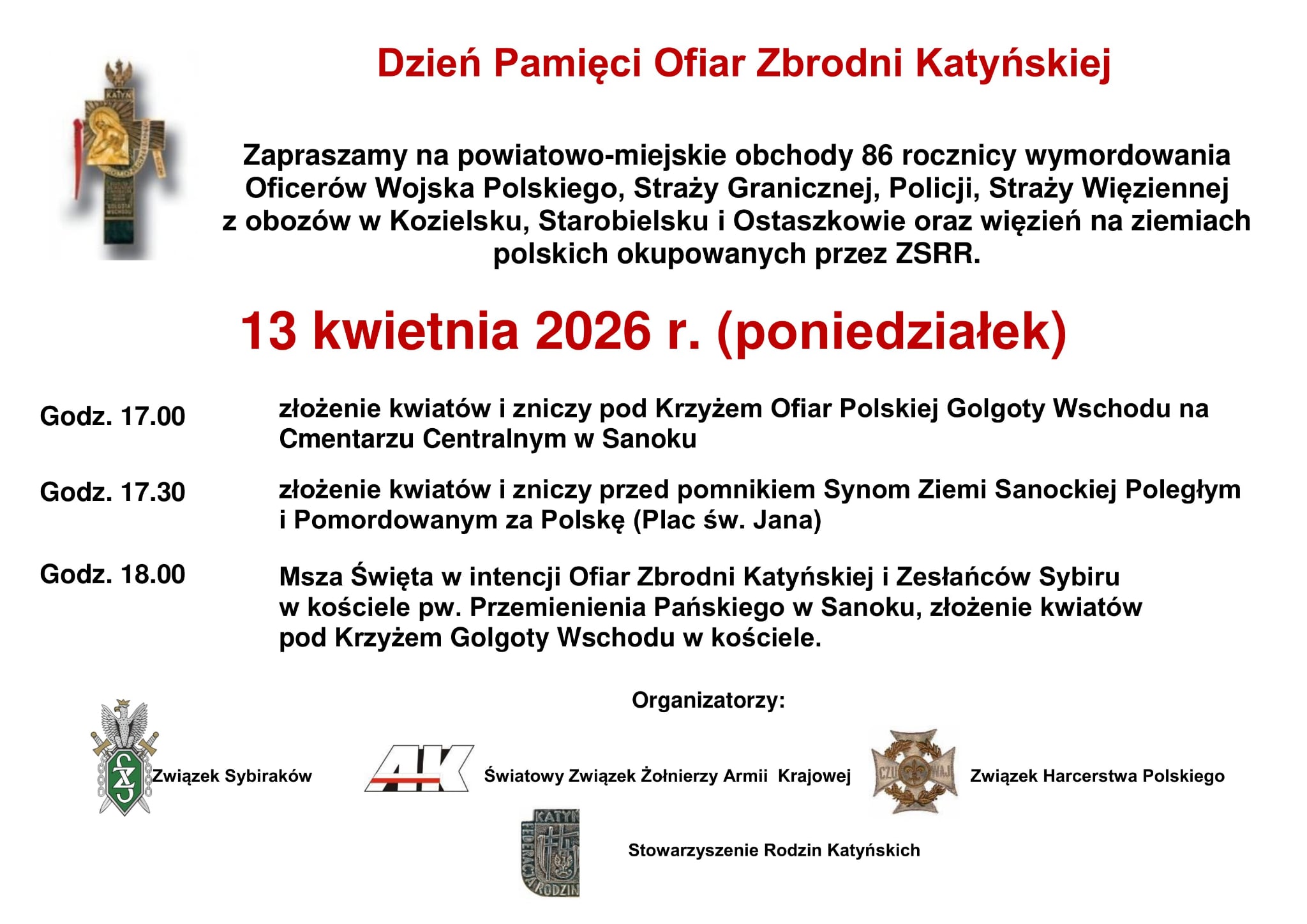W poniedziałek, 13 kwietnia, w Sanoku odbędą się powiatowo–miejskie obchody 86. rocznicy upamiętniające Ofiary Zbrodni Katyńskiej. Uroczystości mają na celu oddanie hołdu oficerom Wojska Polskiego, funkcjonariuszom Straży Granicznej, Policji oraz Straży Więziennej, zamordowanym przez NKWD w 1940 roku.