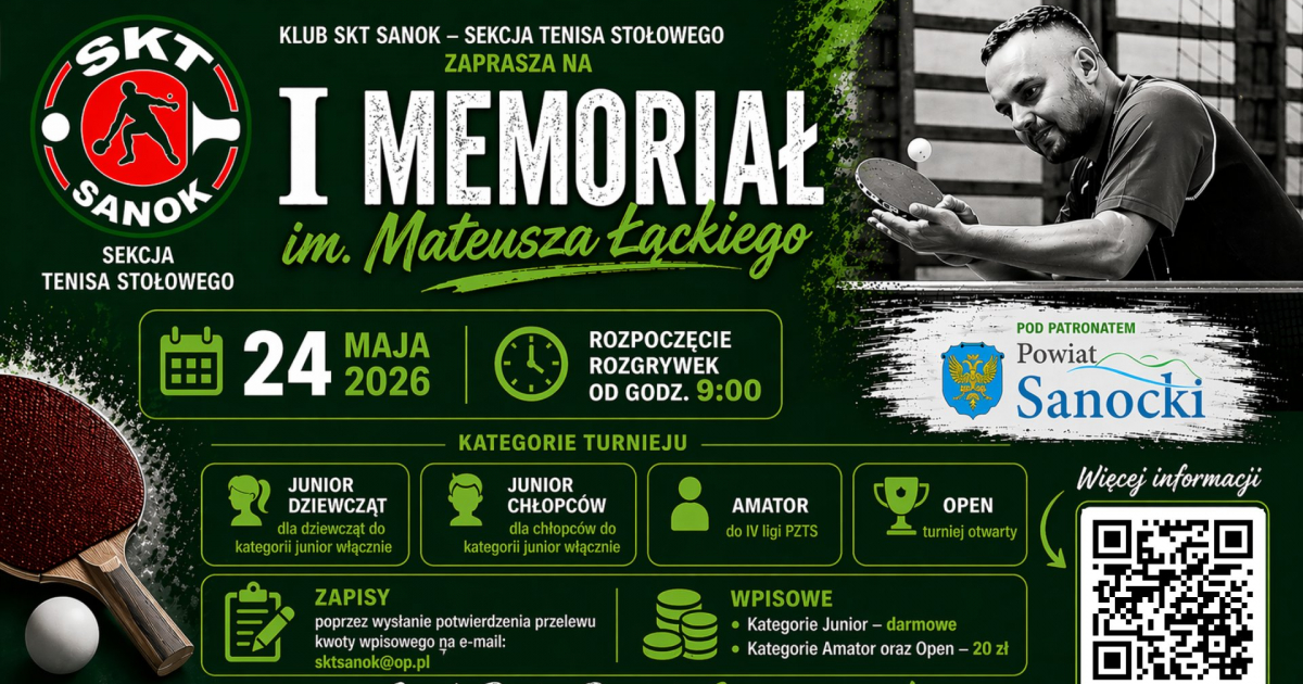 Sekcja tenisa stołowego klubu SKT Sanok zaprasza na wyjątkowe wydarzenie sportowe. 24 maja w hali I Liceum Ogólnokształcącego odbędzie się I Memoriał im. Mateusza Łąckiego. To turniej, który łączy sportową rywalizację z pamięcią o człowieku, który przez lata aktywnie wspierał rozwój sanockiego tenisa stołowego.