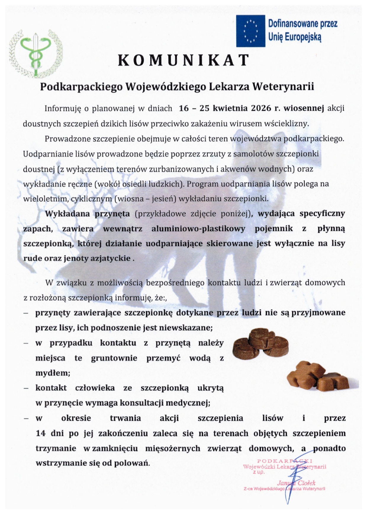 Podkarpacki Wojewódzki Lekarz Weterynarii poinformował o szczegółach nadchodzących działań. Szczepionka będzie podawana w formie doustnej. Na obszarach leśnych i polnych zostaną wykonane zrzuty z samolotów, natomiast w okolicach osiedli ludzkich przynęty będą wykładane ręcznie.