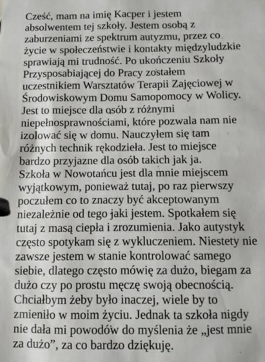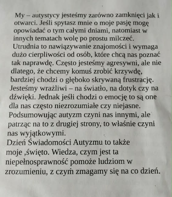 Mocne słowa, które padły w wywiadzie Laury z Mamą chłopca ze spektrum uświadomiły nam, jak z wieloma problemami borykają się opiekunowie na co dzień, jak walczą z systemem, polityką i brakiem wiedzy na temat autyzmu. Wszystkich wzruszył ten wywiad, w którym bez scenariusza i reżyserki Mama odpowiadała na pytania związane z codziennym życiem z dzieckiem w spektrum, opowiadała jak zmieniła Ją rola mamy, jaką jest teraz osobą: „…Mnie już nie ma jako ja, jesteśmy razem ja i moje dziecko, jesteśmy jedno, nie ma mnie bez niego i jego beze mnie…” (cytat). Padło też pytanie o marzenia dla Niej i Syna: „… Ja nie mam marzeń dla siebie, tylko jedno dla Syna, aby kiedy mnie zabraknie, umiał poradzić sobie w życie… „(cytat). Wśród zdjęć znajduje się też przekaz naszego absolwenta Kacpra, który zawsze jest przygotowany do wystąpienia ze swoimi przemyśleniami.