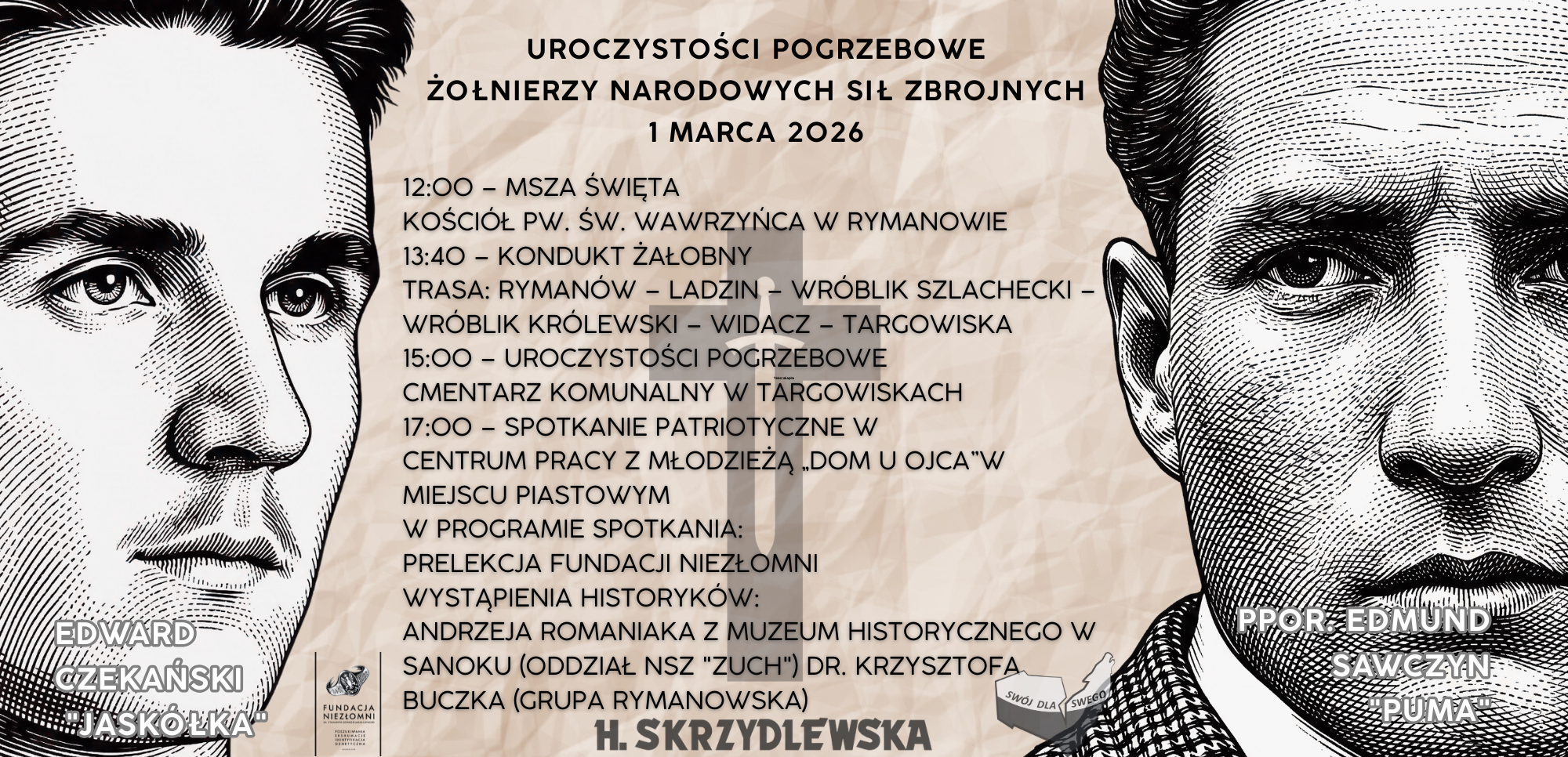 W niedzielę, 1 marca 2026 roku, odbędą się uroczystości pogrzebowe żołnierzy Narodowych Sił Zbrojnych: śp. ppor. Edmunda Sawczyna ps. „Puma” oraz śp. Edwarda Czekańskiego ps. „Jaskółka”. Wydarzenie będzie miało charakter patriotyczny i zgromadzi przedstawicieli środowisk kombatanckich, historycznych oraz mieszkańców regionu.