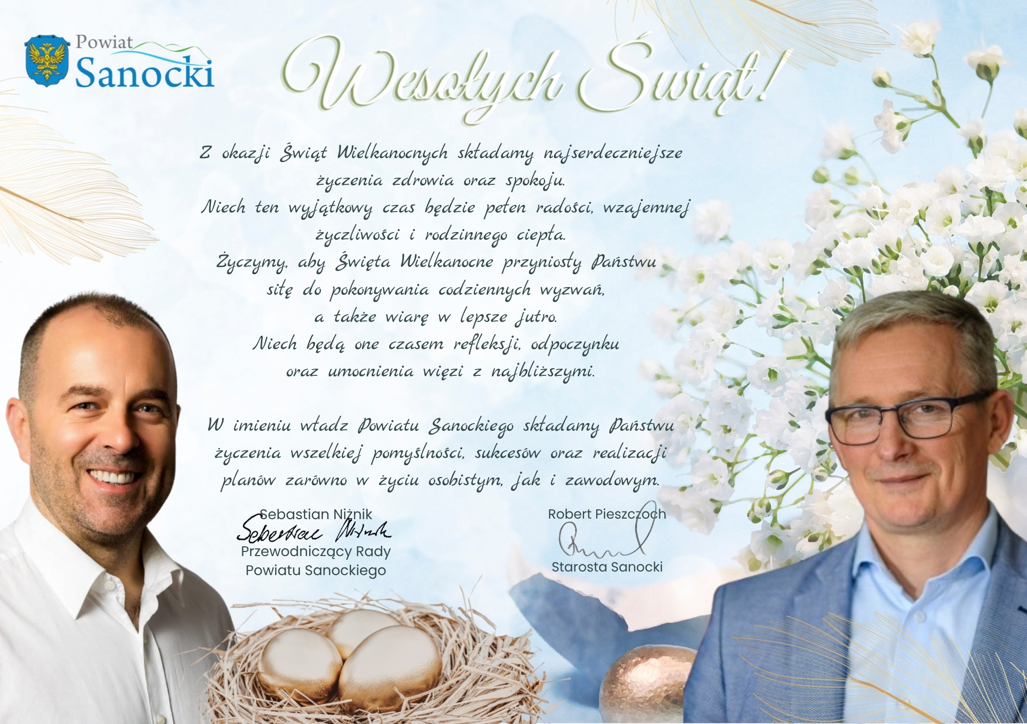 Z okazji Świąt Wielkanocnych najserdeczniejsze życzenia zdrowia, pogody ducha oraz głębokiego spokoju wszystkim Mieszkańcom powiatu sanockiego składają Starosta Sanocki Robert Pieszczoch oraz Przewodniczący Rady Powiatu Sanockiego Sebastian Niżnik.