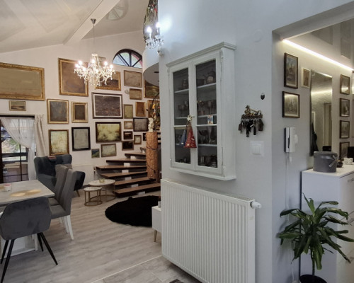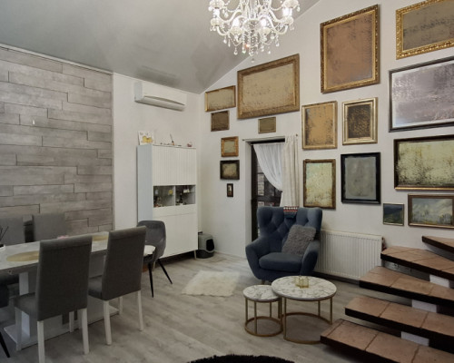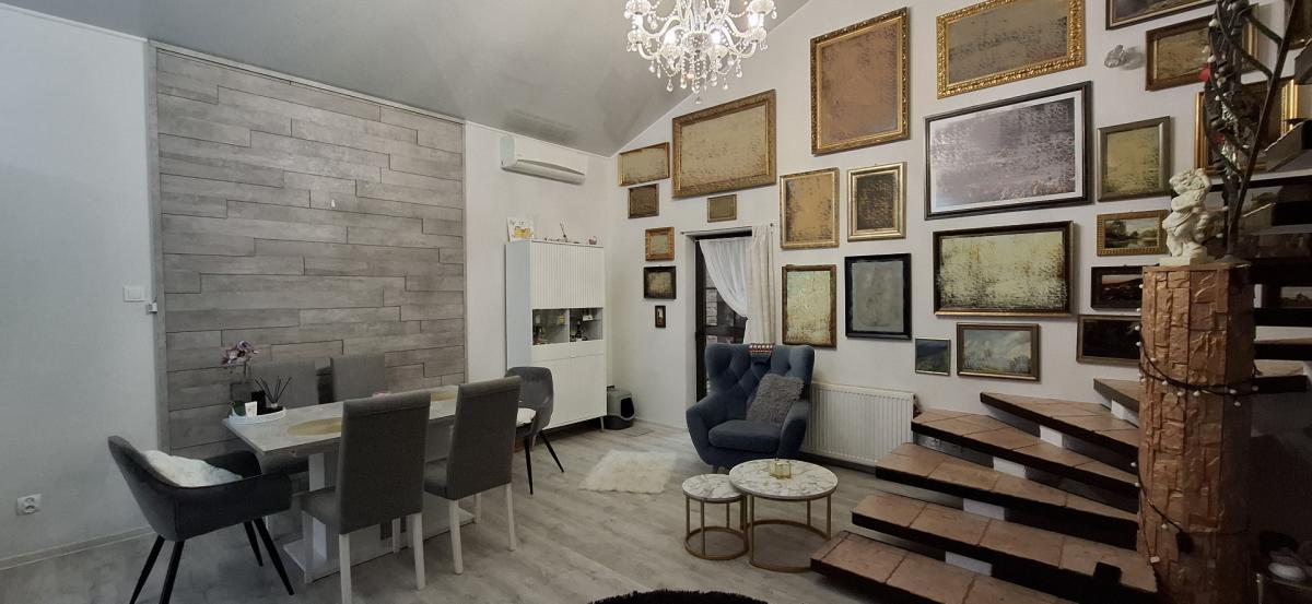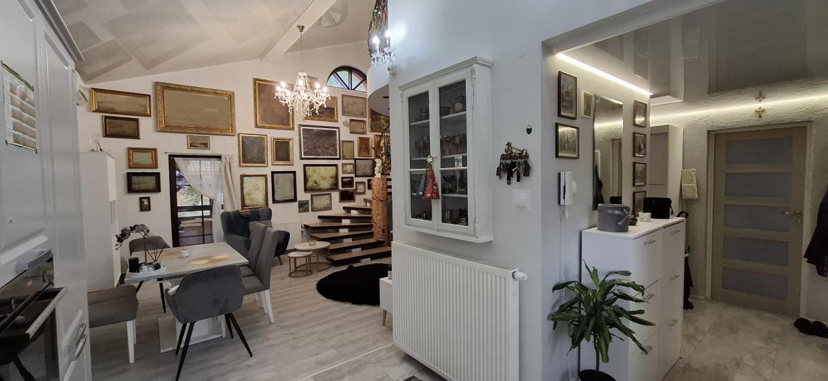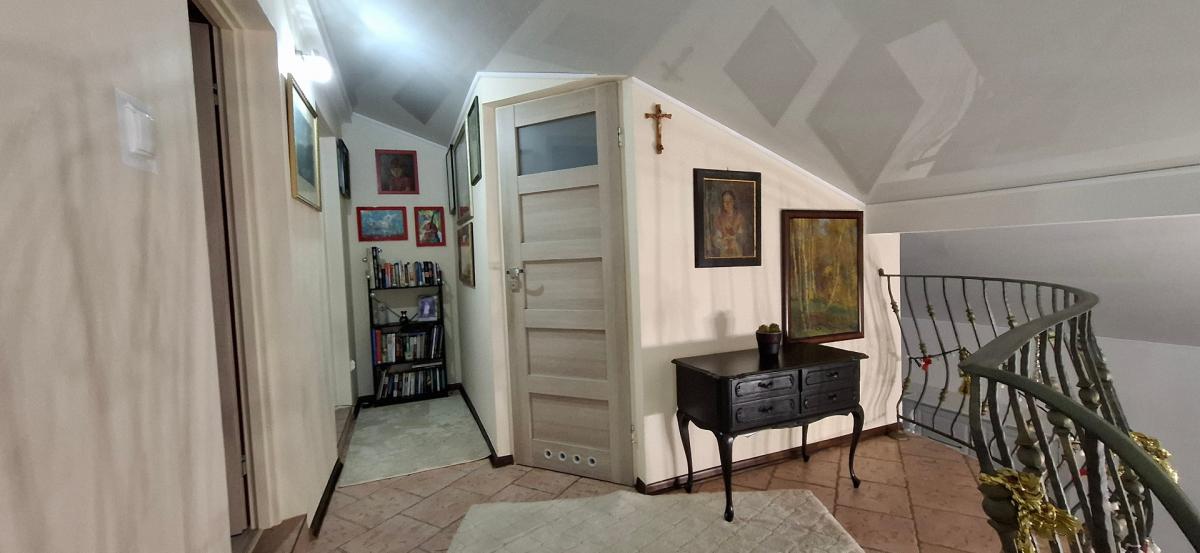 W salonie wysoki , szklany sufit, podłogi wyłożone panelami, w przedpokoju płytki. Ażurowe schody prowadzące na poddasze. Okna drewniane, nowe pokrycie dachu.