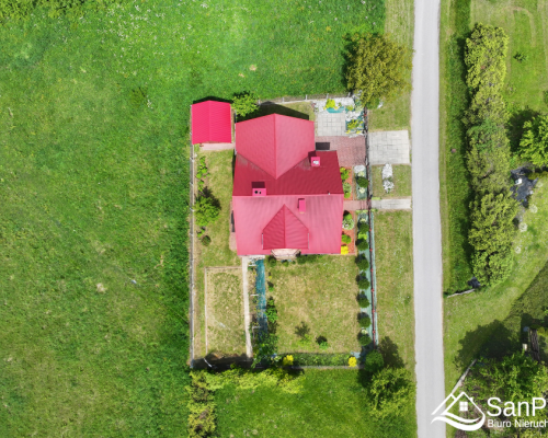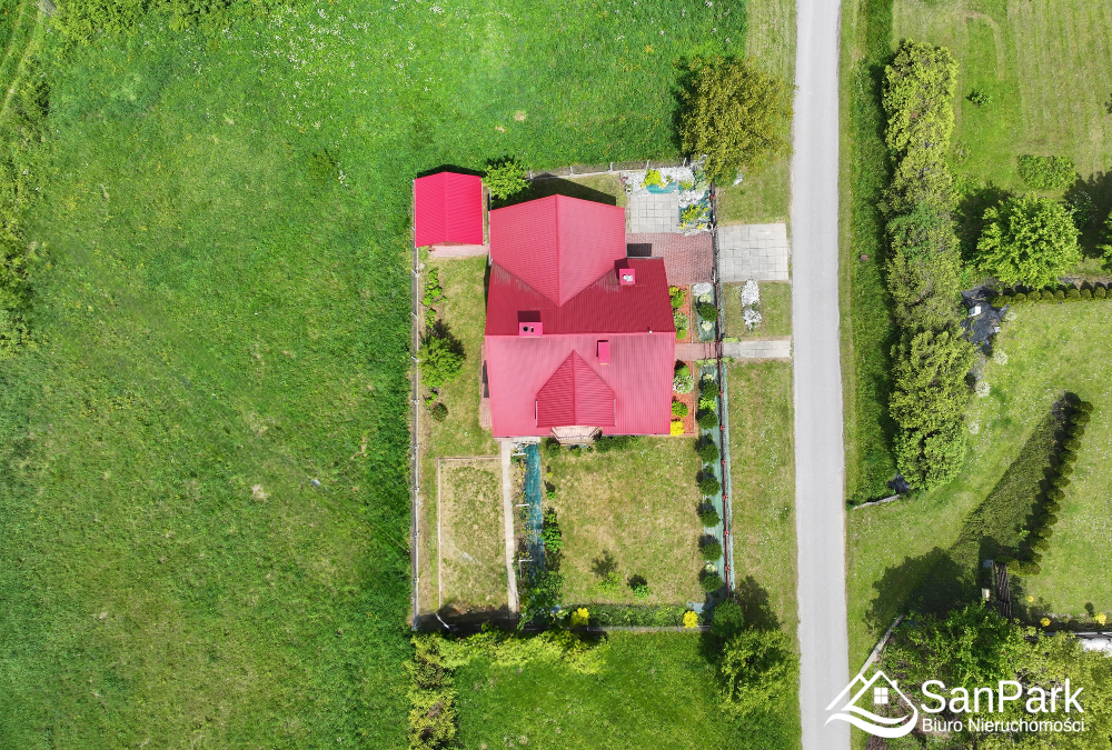 Wybudowany w 2014 roku budynek jest w świetnej kondycji technicznej – ocieplony, z oknami PCV, a w jego bryle umieszczono praktyczny garaż z segmentową bramą. Całość została zaprojektowana tak, aby dom był funkcjonalny, a jednocześnie przytulny i gotowy do zamieszkania bez jakichkolwiek inwestycji.