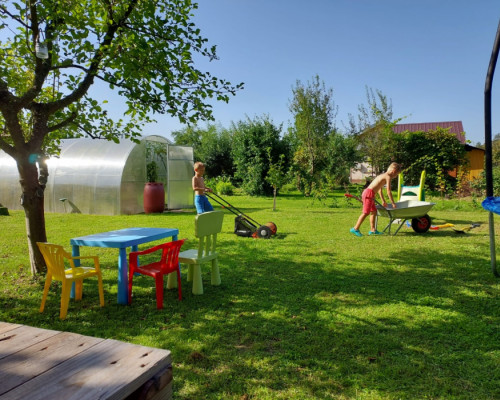 Na działce znajduje się murowana, ocieplona altanka z pomieszczeniem gospodarczym i toaletą. W altance jest aneks kuchenny, rozkładana kanapa, szafa, mała lodówka i kuchenka elektryczna.Na działce jest piaskownica, dwie drewniane podwyższone grządki na warzywa, drzewa oraz krzewy owocowe. Szklarnia z poliwęglanu 3x6m, kran podłączony do lokalnej (działkowej) sieci wodociągowej, prąd i kanalizacja deszczowa.